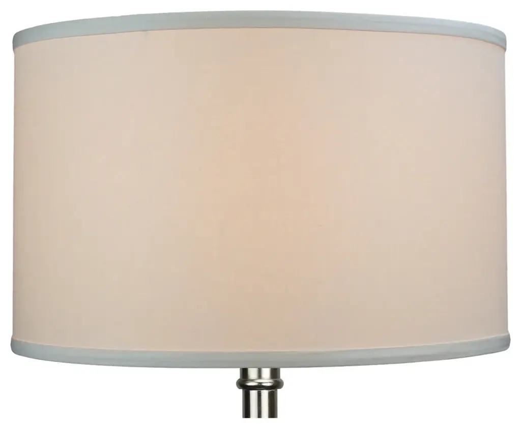 This Fenchel Shades lamp shade has a top diameter of 14 inches, a bottom diameter of 16 inches, and a slant height of 9.5 inches. The vertical height of this shade is about 9.5 inches. This attachment is called a washer attachment and is nickel in color. It is also known as a spider attachment. If your lamp has a harp, then you will generally need a washer attachment. The hole size (inner-dimension) of a washer attachment measures slightly under 1/2 inch. The drop on this particular attachment is 1/2 inch. That means, it recesses about 1/2 inch below the top of the lamp shade. This Product is proudly made in the USA with US materials.
