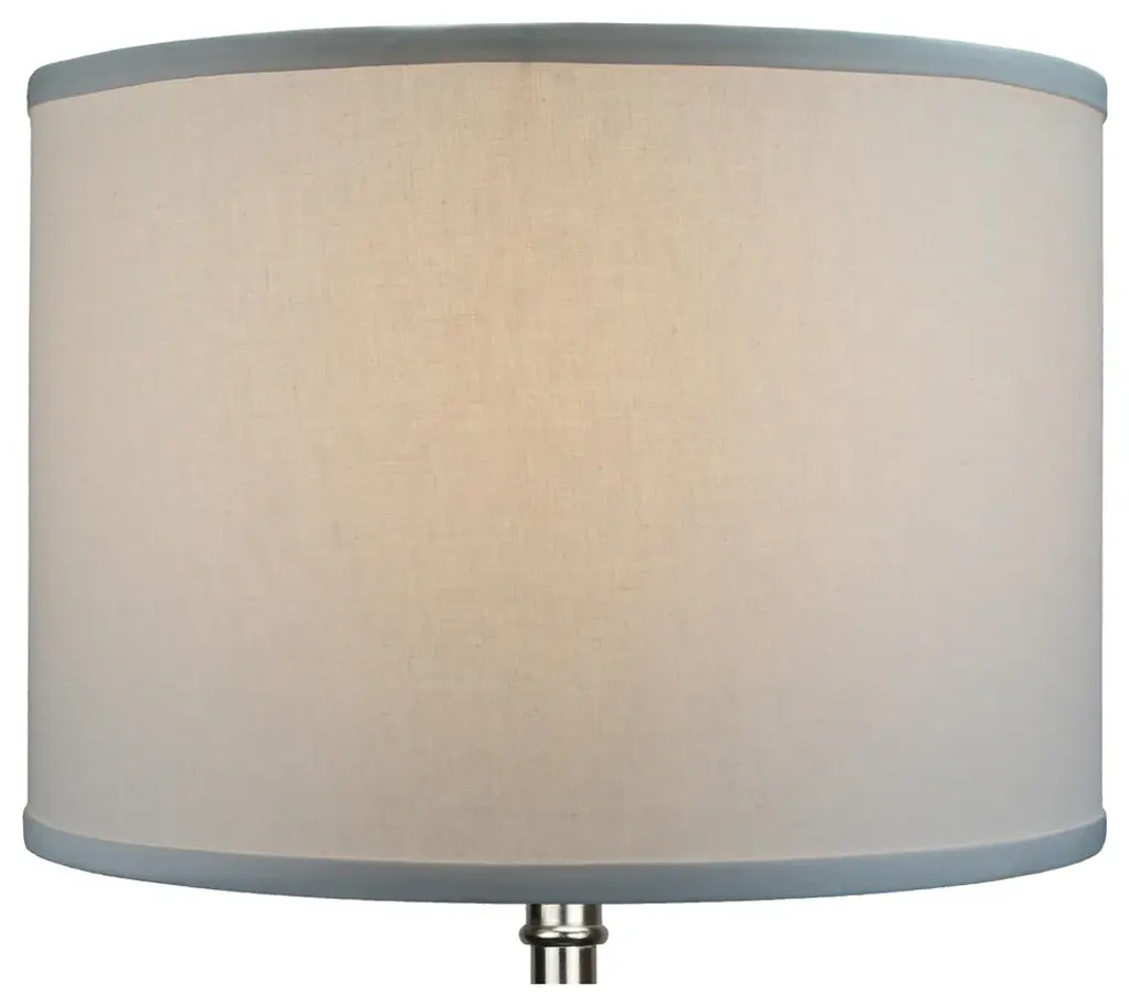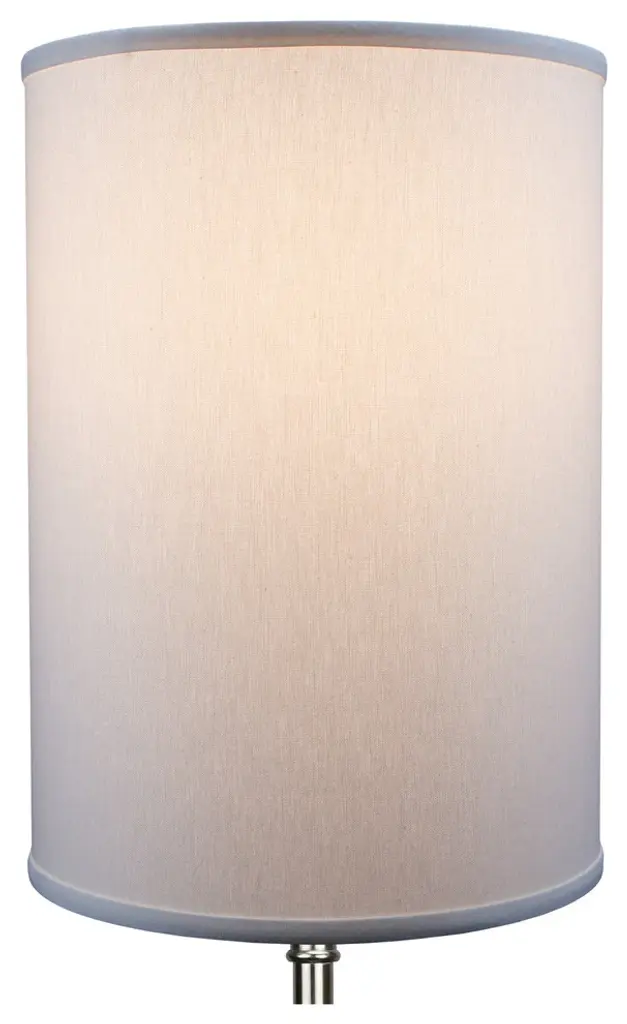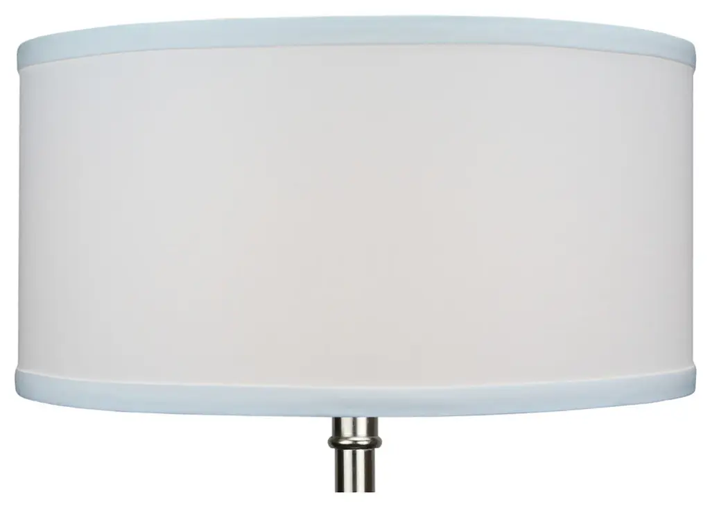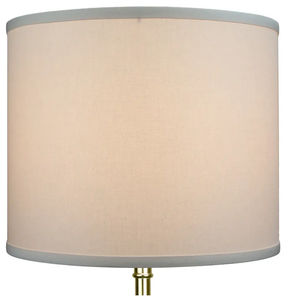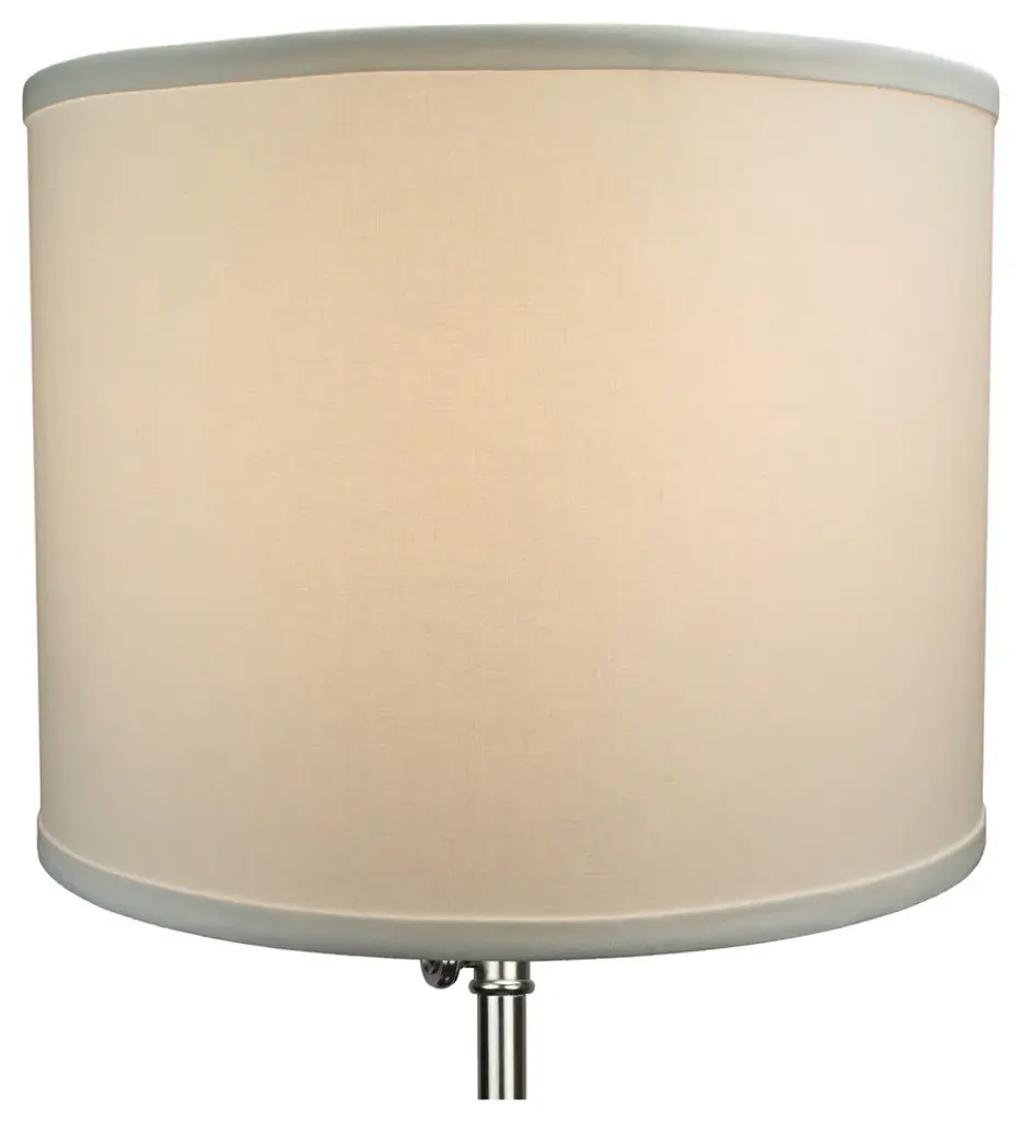 This lamp shade is made with pride in the USA, and construction does not begin until you place your order. This shade measures 16" Top Diameter x 16" Bottom Diameter x 18" Height. This shade is equipped with a nickel finish washer fitter. This is the most common fitter type. It consists of a small washer with an inner diameter hole size of approximately 1/2". The washer generally rests on the top of a metal harp above the light bulb and is held in place by a screw-on finial. The outside of the lamp shade has a fabric covering. The inside is a white styrene (white plastic). The top and bottom of this item is adorned with a 1/2" band of single fold lampshade trim. The trim is the same color as the covering.