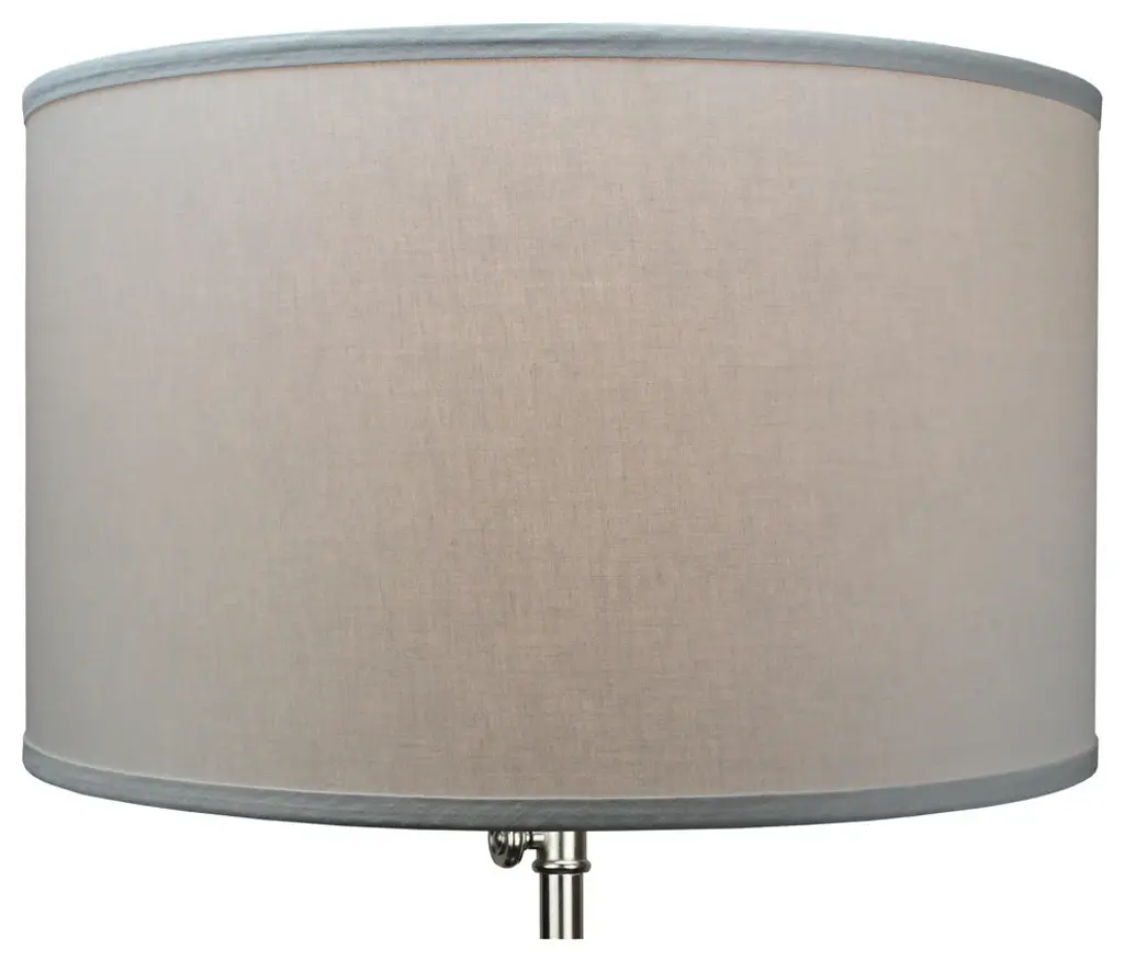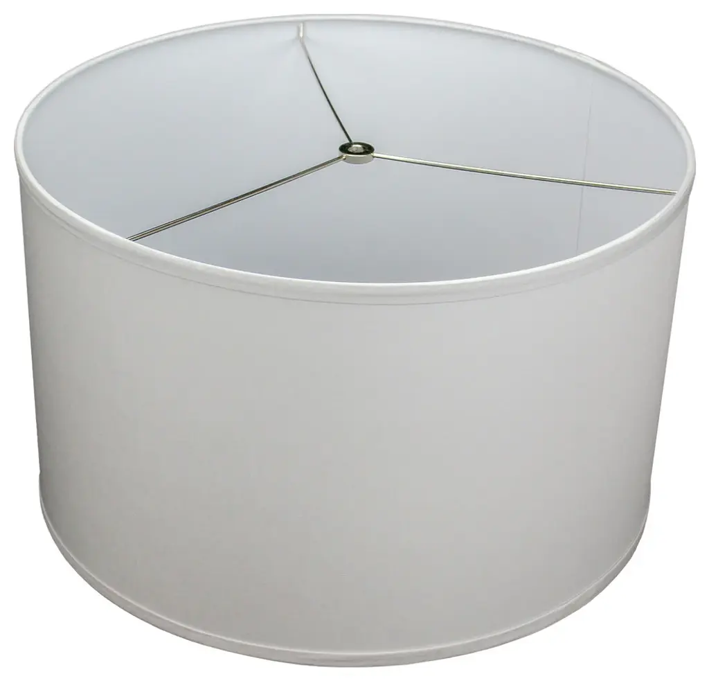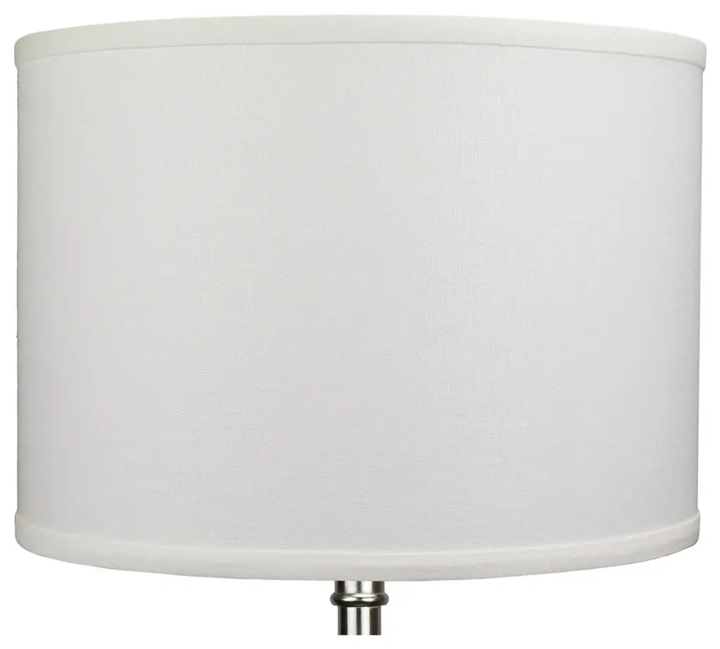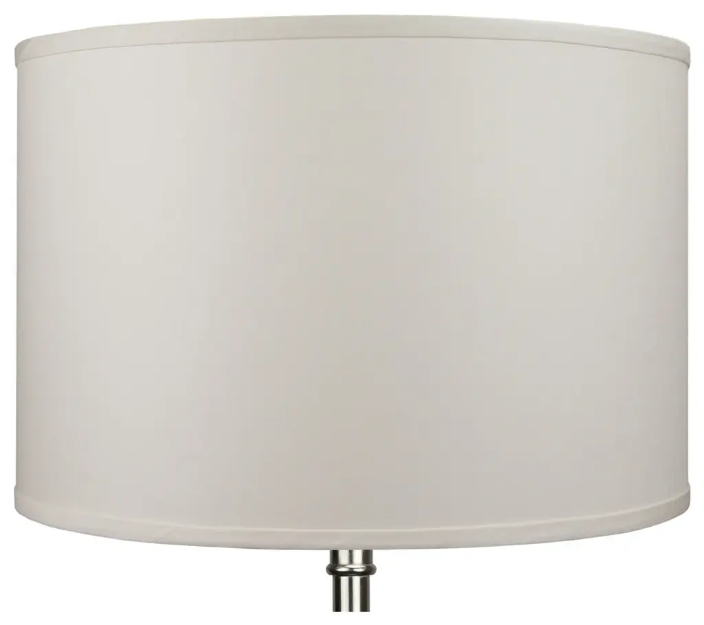 This lamp shade is made with pride in the USA, and construction does not begin until you place your order. This shade measures 18" Top Diameter x 18" Bottom Diameter x 11" Height. The shade is equipped with a Nickel Finish Washer fitter. This is the most common fitter type. It consists of a small washer with an inner diameter hole size of approximately 1/2". The washer generally rests on the top of a metal harp above the light bulb and is held in place by a screw-on finial. The outside of the lamp shade has a fabric covering. The inside is a white styrene (white plastic). The top and bottom of this item is adorned with a 1/2" band of single fold lampshade trim. The trim is the same color as the covering.