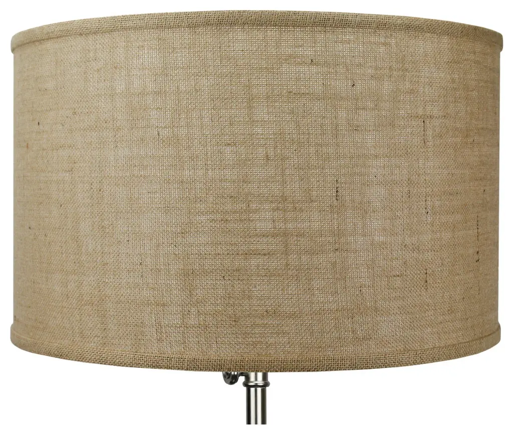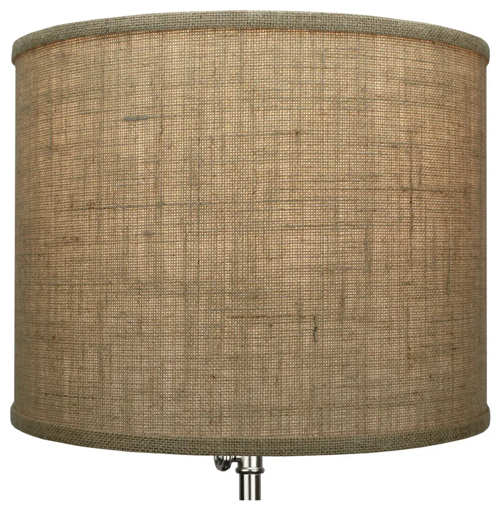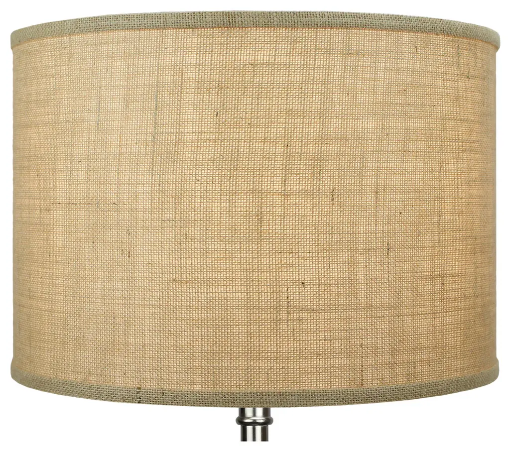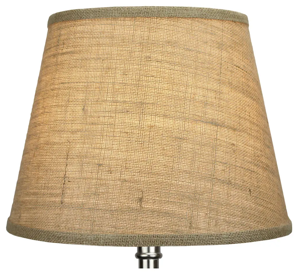 This lamp shade is made with pride in the USA, and construction does not begin until you place your order. This shade is equipped with a Nickel Finish Washer fitter. This is the most common fitter type. It consists of a small washer with an inner diameter hole size of approximately 1/2". The washer generally rests on the top of a metal harp above the light bulb and is held in place by a screw-on finial. The outside of the lamp shade is a textured Burlap fabric covering. The inside is a white styrene (white plastic). The top and bottom of this item is adorned with a 1/2" band of single fold lampshade trim. The trim is the same color as the covering.