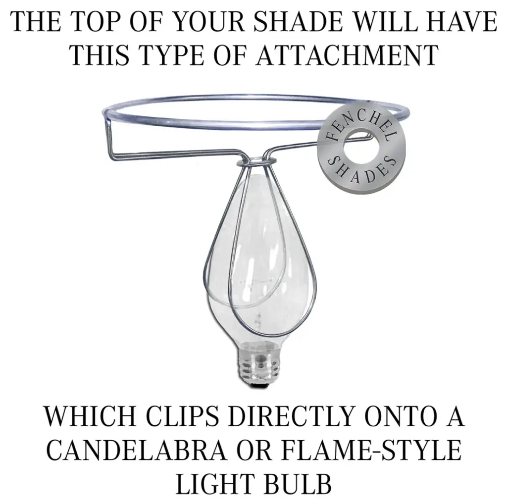 This Fenchel Shades lamp shade has a top diameter of 3 inches, a bottom diameter of 6 inches, and a slant height of 5 inches. The vertical height of this shade is about 4.75 inches. The attachment type is a Flame clip with nickel finish Flame clips are most commonly used on standard flame-style bulbs often found on chandelier fixtures. This Product is proudly made in the USA with US materials.• Please note the COLOR of this shade is represented in the color swatch picture•