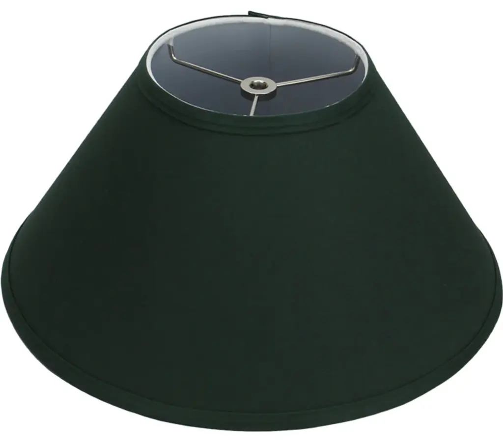 This Fenchel Shades lamp shade has a top diameter of 4 inches, a bottom diameter of 14 inches, and a slant height of 9 inches. The vertical height of this shade is about 7.5 inches. This attachment is called a washer attachment and is nickel in color. It is also known as a spider attachment. If your lamp has a harp, then you will generally need a washer attachment. The hole size (inner-dimension) of a washer attachment measures slightly under 1/2 inch. The drop on this particular attachment is 1/2 inch. That means, it recesses about 1/2 inch below the top of the lamp shade. This Product is proudly made in the USA with US materials.• Please note the COLOR of this shade is represented in the color swatch picture•