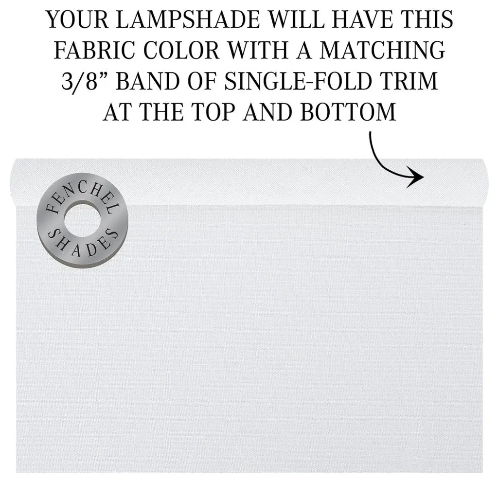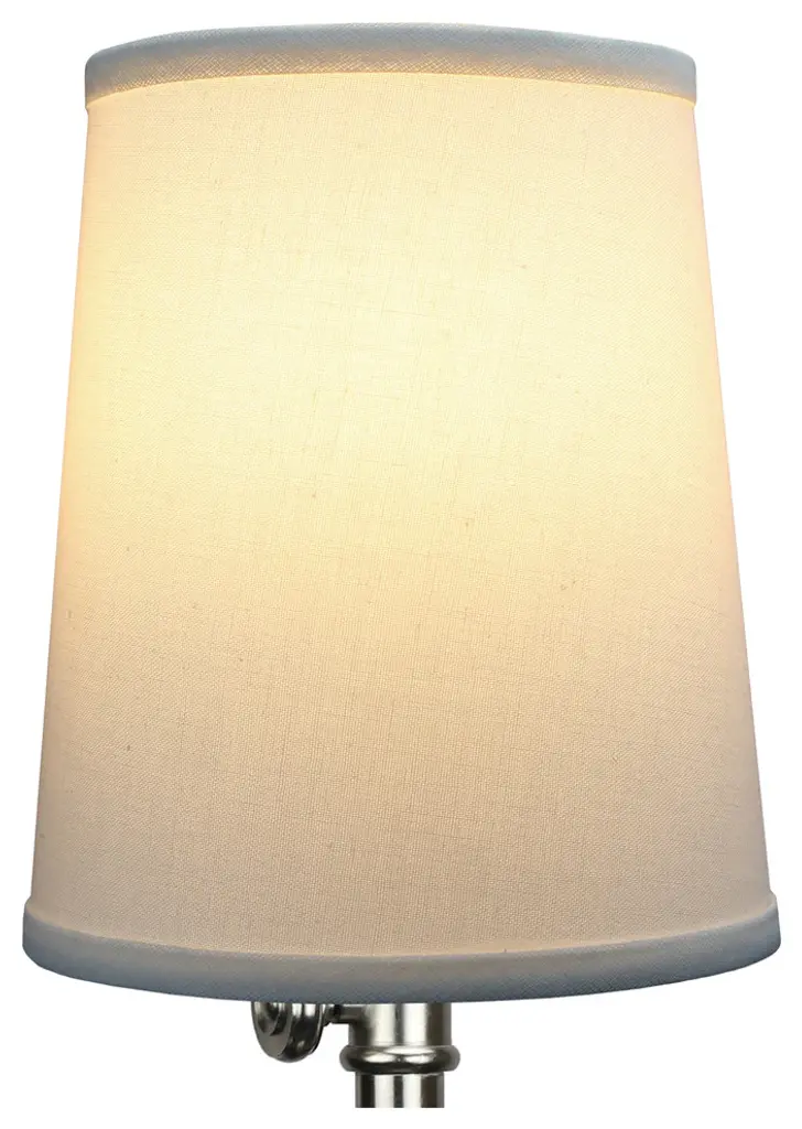 This lamp shade is made with pride in the USA, and construction does not begin until you place your order. This shade measures 4" Top Diameter x 5" Bottom Diameter x 6" Slant Height. The shade is equipped with a nickel bulb-clip attachment. This lampshade clips on to an existing lamp with a standard styled light bulb. The bulb-clip attachment has a standard 1/2" drop, or recess, from the top of the shade. The outside of the lamp shade has a fabric covering. The inside is a white styrene (white plastic). The top and bottom of this item is adorned with a band of single fold lampshade trim. The trim is the same color as the covering.