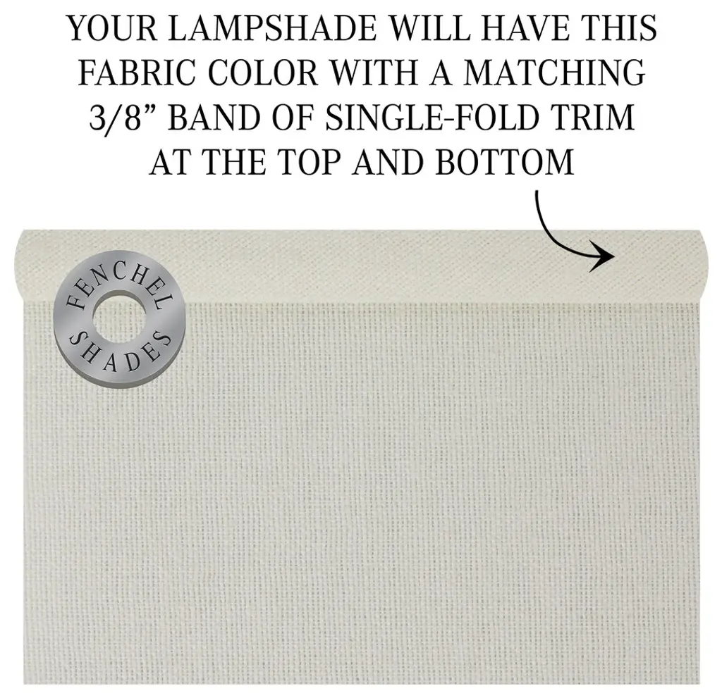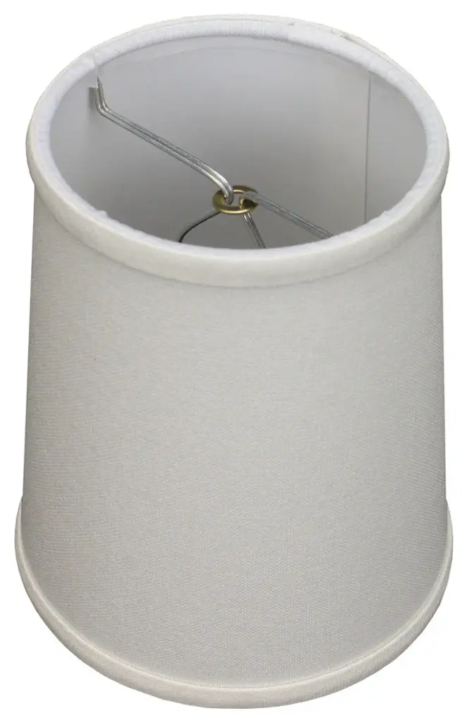 This lamp shade is made with pride in the USA, and construction does not begin until you place your order. This shade measures 4" Top Diameter x 5" Bottom Diameter x 6" Slant Height. The shade is equipped with a nickel bulb-clip attachment. This lampshade clips on to an existing lamp with a standard styled light bulb. The bulb-clip attachment has a standard 1/2" drop, or recess, from the top of the shade. The outside of the lamp shade has a fabric covering. The inside is a white styrene (white plastic). The top and bottom of this item is adorned with a band of single fold lampshade trim. The trim is the same color as the covering.