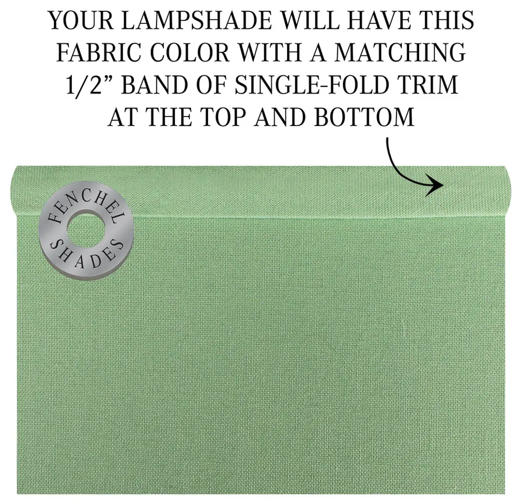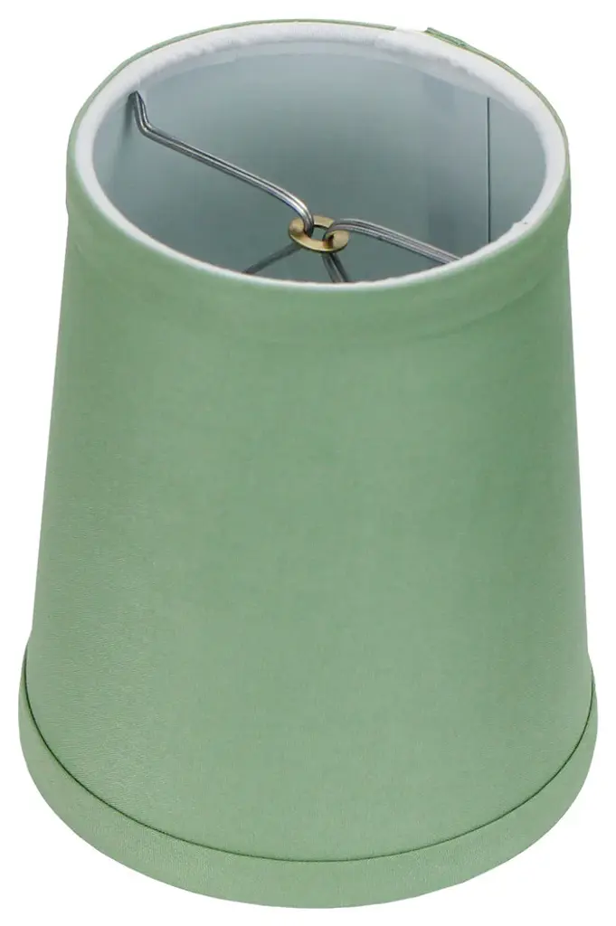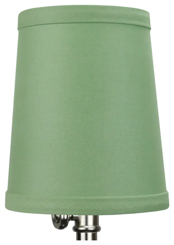 This lamp shade is made with pride in the USA, and construction does not begin until you place your order. This shade measures 4" Top Diameter x 5" Bottom Diameter x 6" Slant Height. The shade is equipped with a nickel bulb-clip attachment. This lampshade clips on to an existing lamp with a standard styled light bulb. The bulb-clip attachment has a standard 1/2" drop, or recess, from the top of the shade. The outside of the lamp shade has a fabric covering. The inside is a white styrene (white plastic). The top and bottom of this item is adorned with a band of single fold lampshade trim. The trim is the same color as the covering.