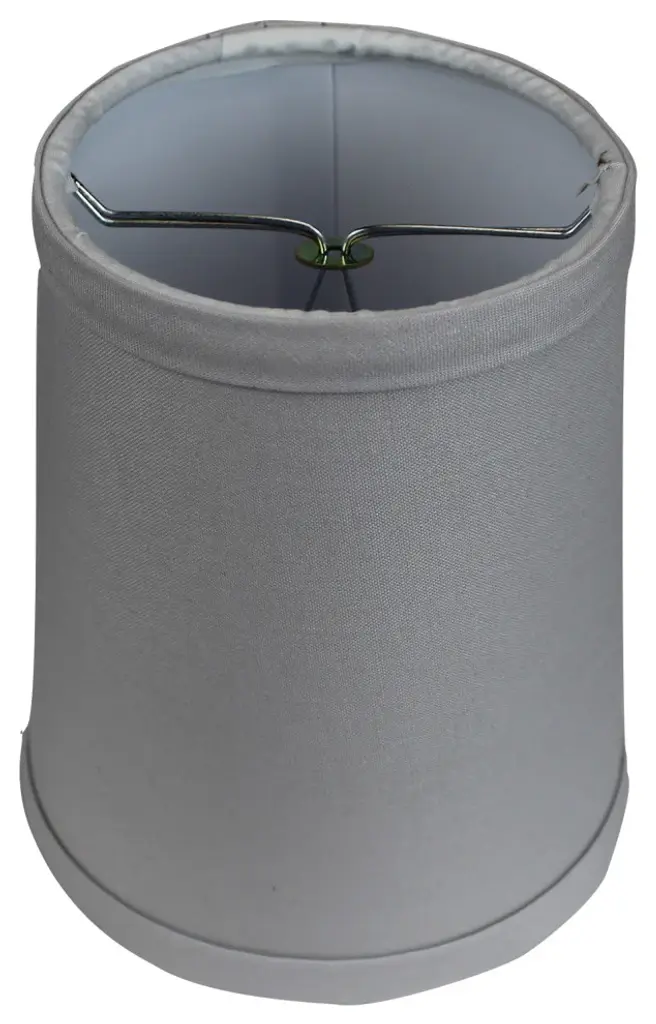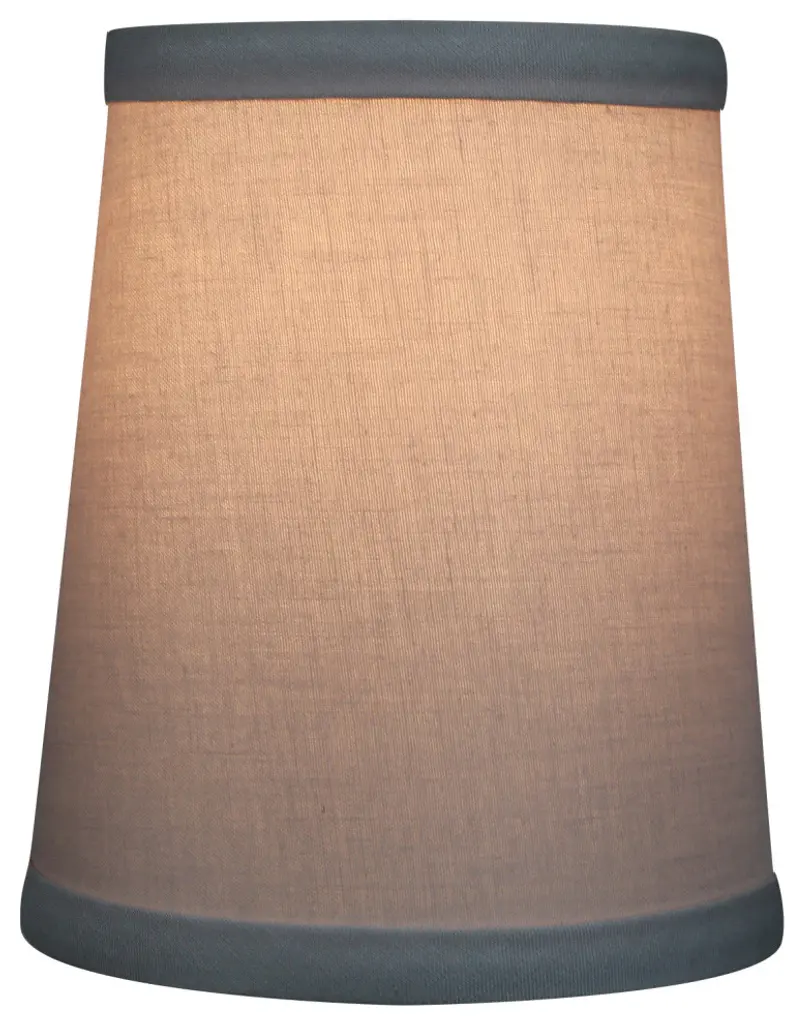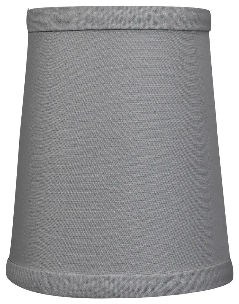 This lamp shade is made with pride in the USA, and construction does not begin until you place your order. This shade measures 4" Top Diameter x 5" Bottom Diameter x 6" Slant Height. The shade is equipped with a nickel flame-clip attachment. This lampshade clips on to an existing lamp with a candelabra or flame-style light bulb. The flame-clip attachment has a standard 1/2" drop, or recess, from the top of the shade. The outside of the lamp shade has a fabric covering. The inside is a white styrene (white plastic). The top and bottom of this item is adorned with a band of single fold lampshade trim. The trim is the same color as the covering.• Please note the COLOR of this shade is represented in the color swatch picture•