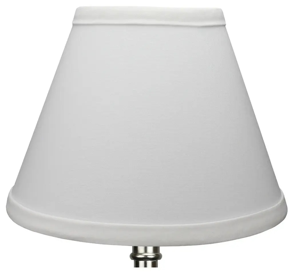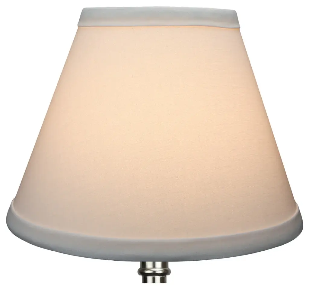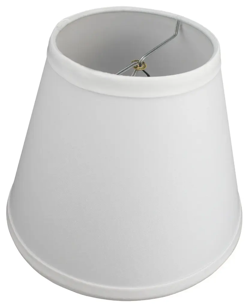 This lamp shade is made with pride in the USA, and construction does not begin until you place your order. This shade measures 4" Top Diameter x 8" Bottom Diameter x 6" Slant Height. The shade is equipped with a nickel bulb-clip attachment. This lampshade clips on to an existing lamp with a standard styled light bulb. The bulb-clip attachment has a standard 1/2" drop, or recess, from the top of the shade. The outside of the lamp shade has a fabric covering. The inside is a white styrene (white plastic). The top and bottom of this item is adorned with a 1/2" band of single fold lampshade trim. The trim is the same color as the covering.