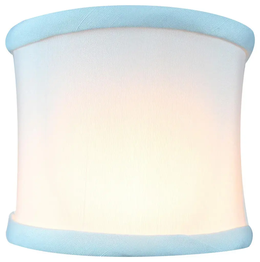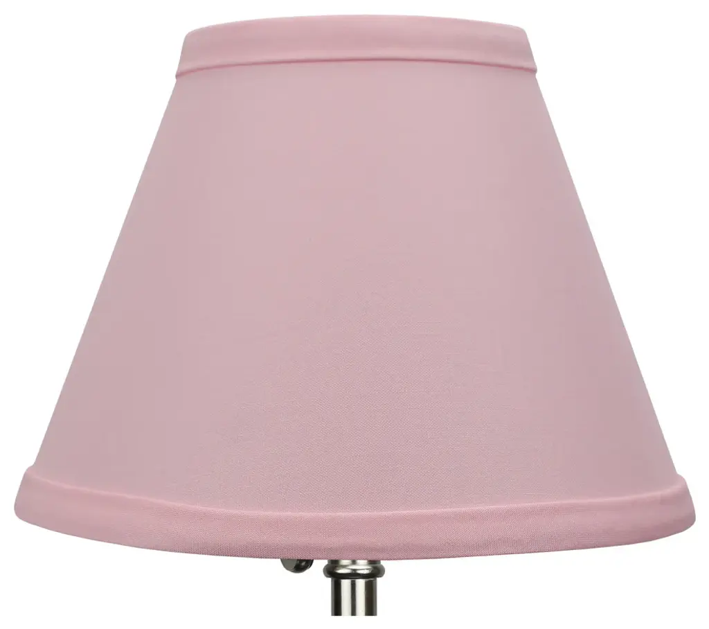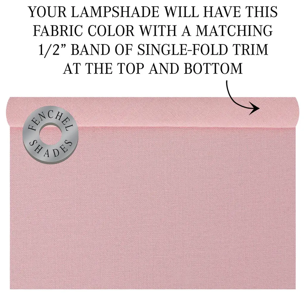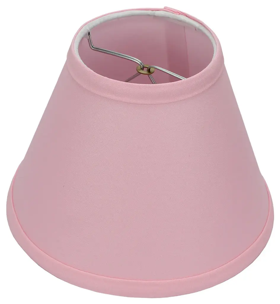 This lamp shade is made with pride in the USA, and construction does not begin until you place your order. This shade measures 4" Top Diameter x 8" Bottom Diameter x 6" Slant Height. The shade is equipped with a nickel bulb-clip attachment. This lampshade clips on to an existing lamp with a standard styled light bulb. The bulb-clip attachment has a standard 1/2" drop, or recess, from the top of the shade. The outside of the lamp shade has a fabric covering. The inside is a white styrene (white plastic). The top and bottom of this item is adorned with a 1/2" band of single fold lampshade trim. The trim is the same color as the covering.
