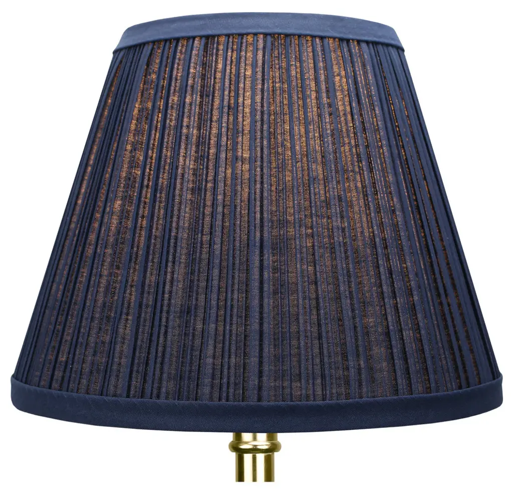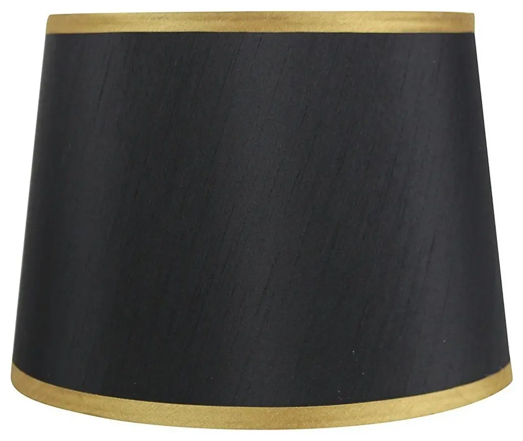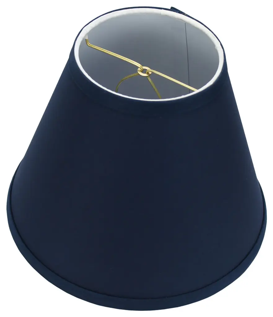 This lamp shade is made with pride in the USA, and construction does not begin until you place your order. This shade measures 5" Top Diameter x 10" Bottom Diameter x 8" Slant Height. The shade is equipped with a brass bulb-clip attachment. This lampshade clips on to an existing lamp with a standard styled light bulb. The bulb-clip attachment has a standard 1/2" drop, or recess, from the top of the shade. The outside of the lamp shade has a fabric covering. The inside is a white styrene (white plastic). The top and bottom of this item is adorned with a 1/2" band of single fold lampshade trim. The trim is the same color as the covering.