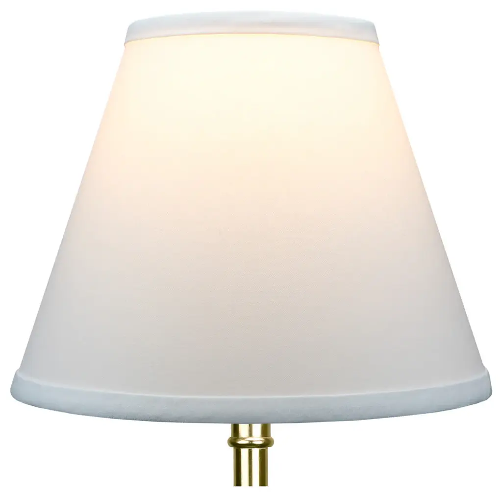 This lamp shade is made with pride in the USA, and construction does not begin until you place your order. This shade measures 5" Top Diameter x 10" Bottom Diameter x 8" Slant Height. The shade is equipped with a brass bulb-clip attachment. This lampshade clips on to an existing lamp with a standard styled light bulb. The bulb-clip attachment has a standard 1/2" drop, or recess, from the top of the shade. The outside of the lamp shade has a fabric covering. The inside is a white styrene (white plastic). The top and bottom of this item is adorned with a 1/2" band of single fold lampshade trim. The trim is the same color as the covering.