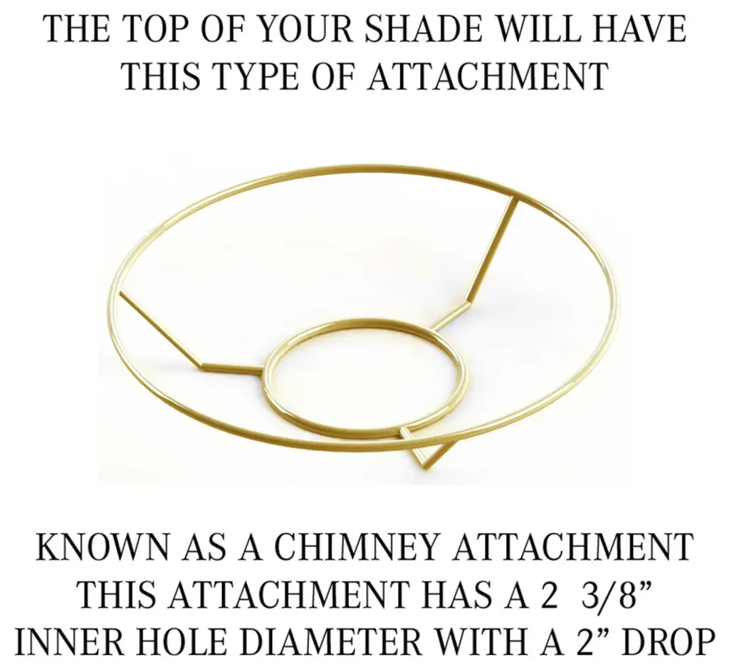 This Fenchel Shades lamp shade has a top diameter of 5 inches, a bottom diameter of 12 inches, and a slant height of 8 inches. The vertical height of this shade is about 7.25 inchesThe attachment type is a Chimney fitter, also referred to as a hurricane fitter. It is not very common anymore, but is necessary if you have a lamp requiring a chimney. Generally, antique lamps--especially oil lamps (hurricane lamps) require the chimney fitter. The chimney fits directly over the glass opening at the top of these kinds of lamps. The inner diameter of a standard chimney fitter is 2 3/8". This particular chimney attachment has a 2-inch drop, meaning the ring attachment sits 2 inches below the top of the lamp shade. This Product is proudly made in the USA with US materials.• First photo is to reference the style of shade, Second photo is the COLOR of the shade•