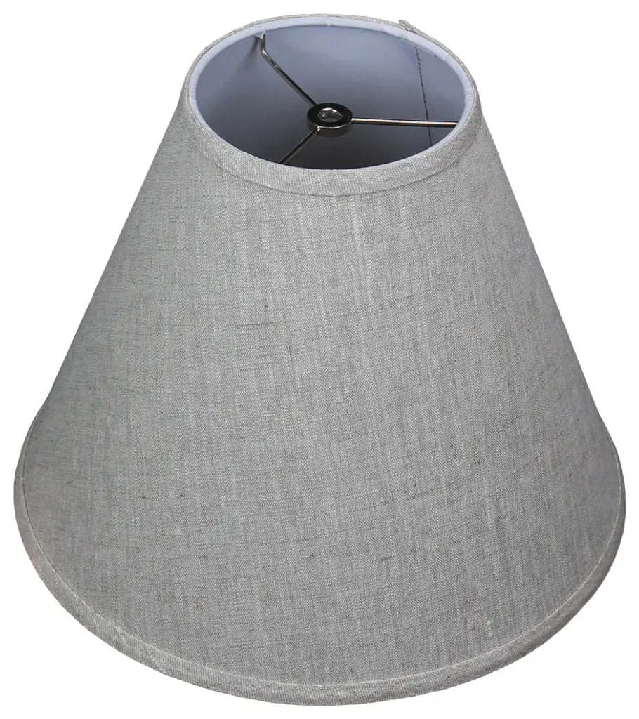 This lamp shade is made with pride in the USA, and construction does not begin until you place your order. This shade measures 5" Top Diameter x 12" Bottom Diameter x 9" Slant Height. The shade is equipped with a Nickel Finish Washer fitter. This is the most common fitter type. It consists of a small washer with an inner diameter hole size of approximately 1/2". The washer generally rests on the top of a metal harp above the light bulb and is held in place by a screw-on finial. The outside of the lamp shade has a fabric covering. The inside is a white styrene (white plastic). The top and bottom of this item is adorned with a 1/2" band of single fold lampshade trim. The trim is the same color as the covering.