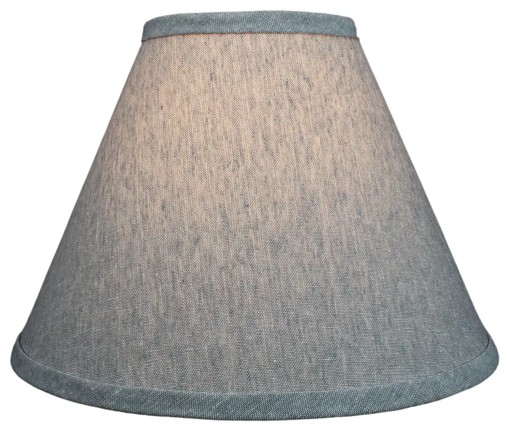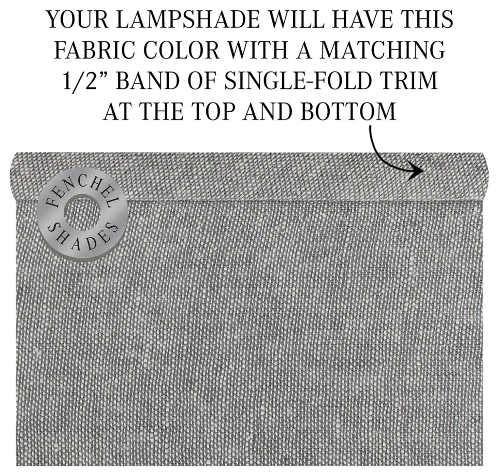 This lamp shade is made with pride in the USA, and construction does not begin until you place your order. This shade measures 5" Top Diameter x 12" Bottom Diameter x 9" Slant Height. The shade is equipped with a Nickel Finish Washer fitter. This is the most common fitter type. It consists of a small washer with an inner diameter hole size of approximately 1/2". The washer generally rests on the top of a metal harp above the light bulb and is held in place by a screw-on finial. The outside of the lamp shade has a fabric covering. The inside is a white styrene (white plastic). The top and bottom of this item is adorned with a 1/2" band of single fold lampshade trim. The trim is the same color as the covering.