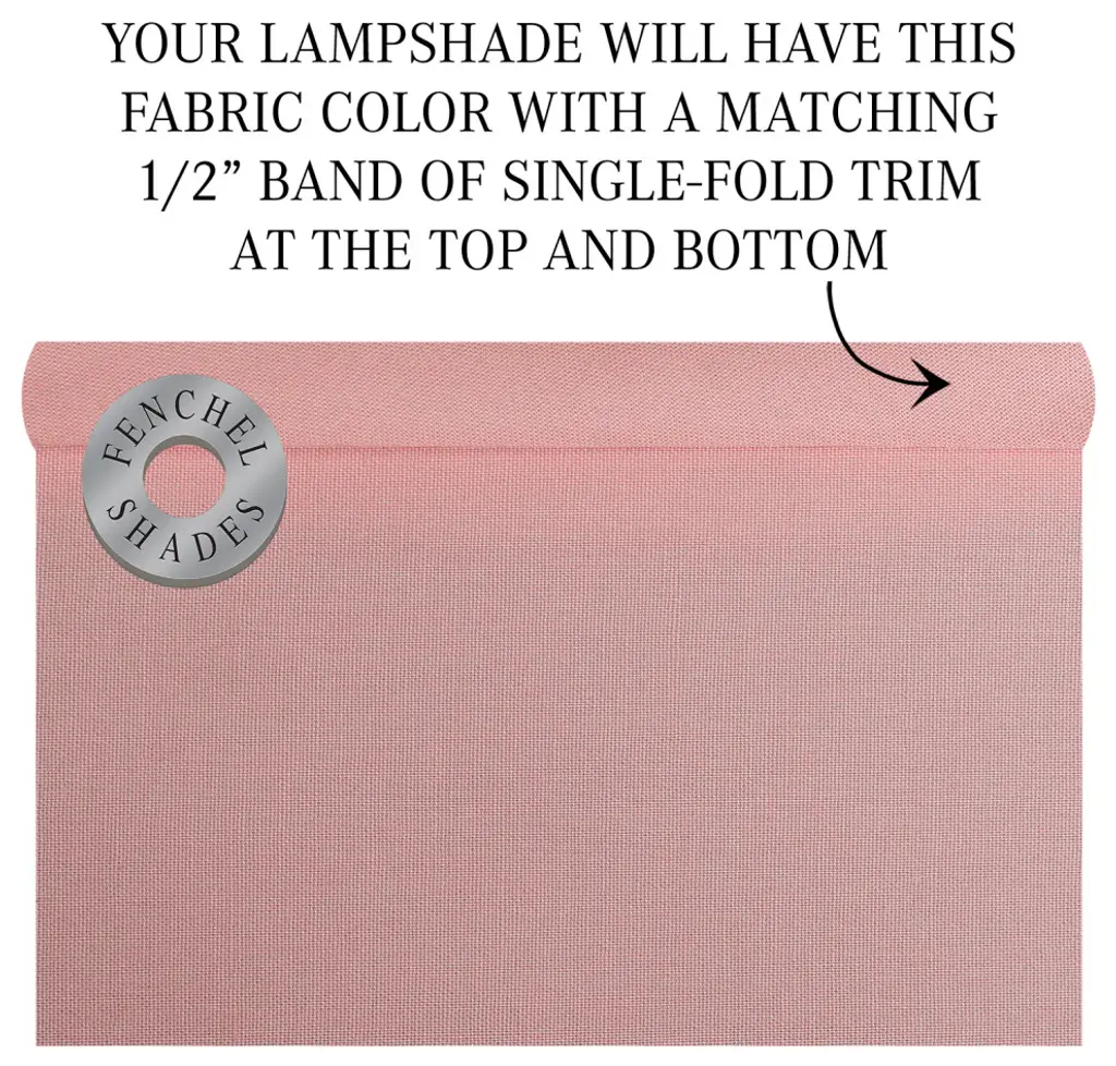 This lamp shade is made with pride in the USA, and construction does not begin until you place your order. This shade measures 5" Top Diameter x 12" Bottom Diameter x 9" Slant Height. The shade is equipped with a Nickel Finish Washer fitter. This is the most common fitter type. It consists of a small washer with an inner diameter hole size of approximately 1/2". The washer generally rests on the top of a metal harp above the light bulb and is held in place by a screw-on finial. The outside of the lamp shade has a fabric covering. The inside is a white styrene (white plastic). The top and bottom of this item is adorned with a 1/2" band of single fold lampshade trim. The trim is the same color as the covering.