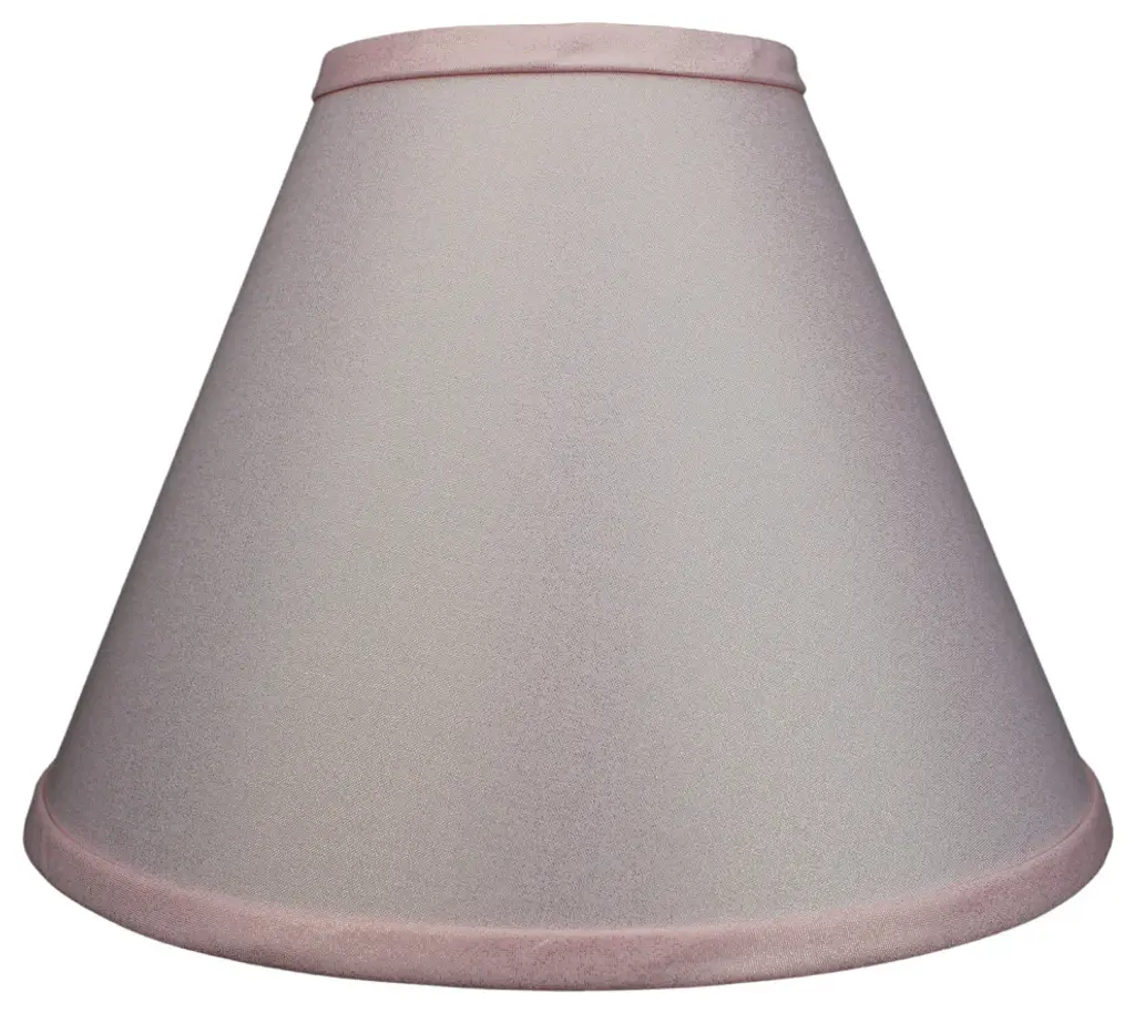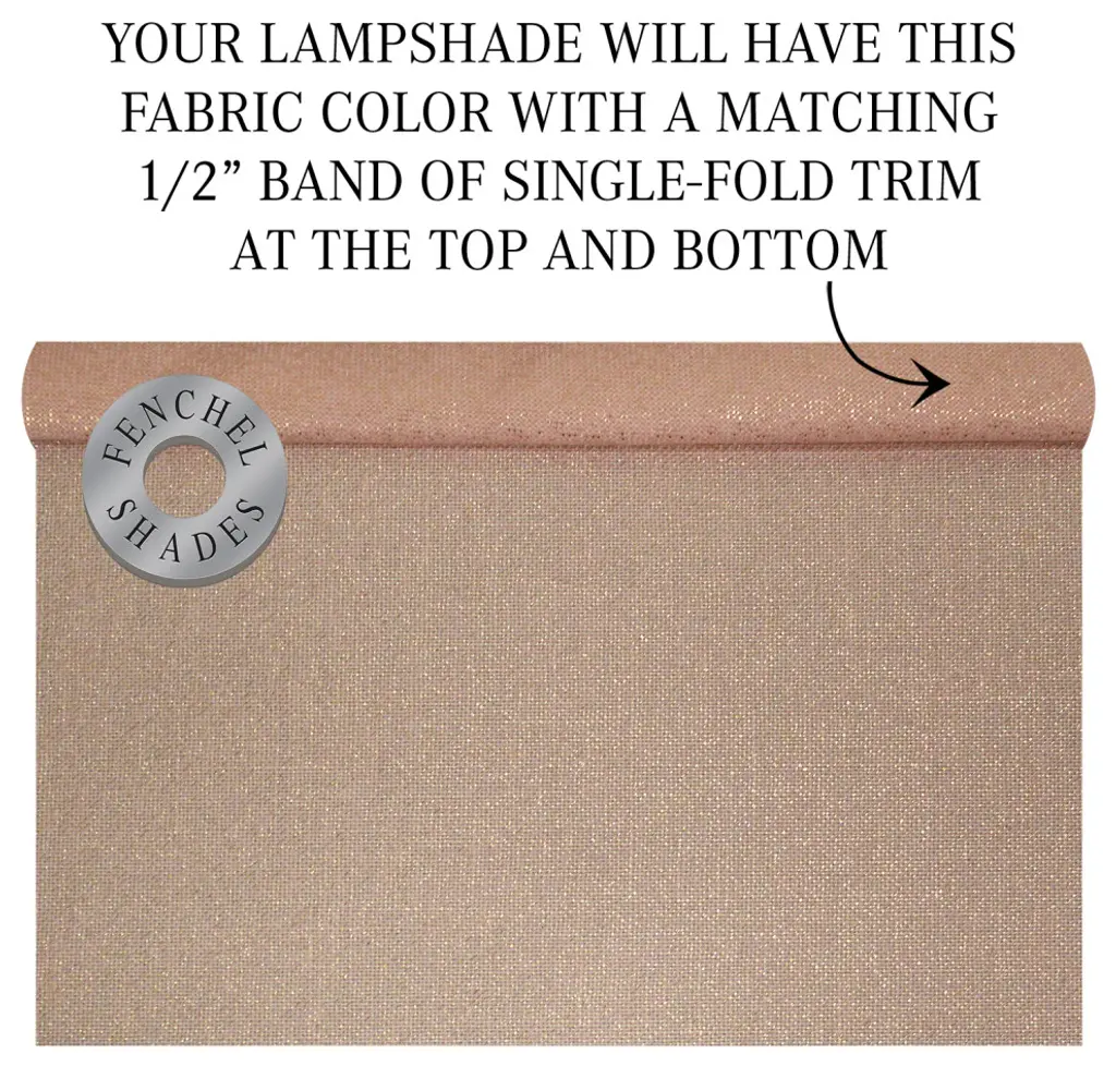 This lamp shade is made with pride in the USA, and construction does not begin until you place your order. This shade measures 5" Top Diameter x 12" Bottom Diameter x 9" Slant Height. The shade is equipped with a Nickel Finish Washer fitter. This is the most common fitter type. It consists of a small washer with an inner diameter hole size of approximately 1/2". The washer generally rests on the top of a metal harp above the light bulb and is held in place by a screw-on finial. The outside of the lamp shade has a fabric covering. The inside is a white styrene (white plastic). The top and bottom of this item is adorned with a 1/2" band of single fold lampshade trim. The trim is the same color as the covering.
