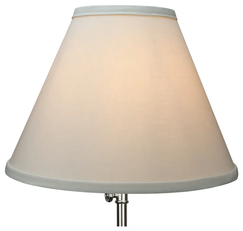 This lamp shade is made with pride in the USA, and construction does not begin until you place your order. This shade measures 5" Top Diameter x 12" Bottom Diameter x 9" Slant Height. The shade is equipped with a Nickel Finish Washer fitter. This is the most common fitter type. It consists of a small washer with an inner diameter hole size of approximately 1/2". The washer generally rests on the top of a metal harp above the light bulb and is held in place by a screw-on finial. The outside of the lamp shade has a fabric covering. The inside is a white styrene (white plastic). The top and bottom of this item is adorned with a 1/2" band of single fold lampshade trim. The trim is the same color as the covering.