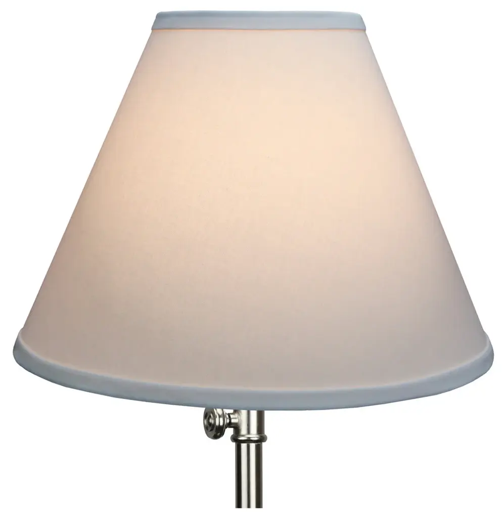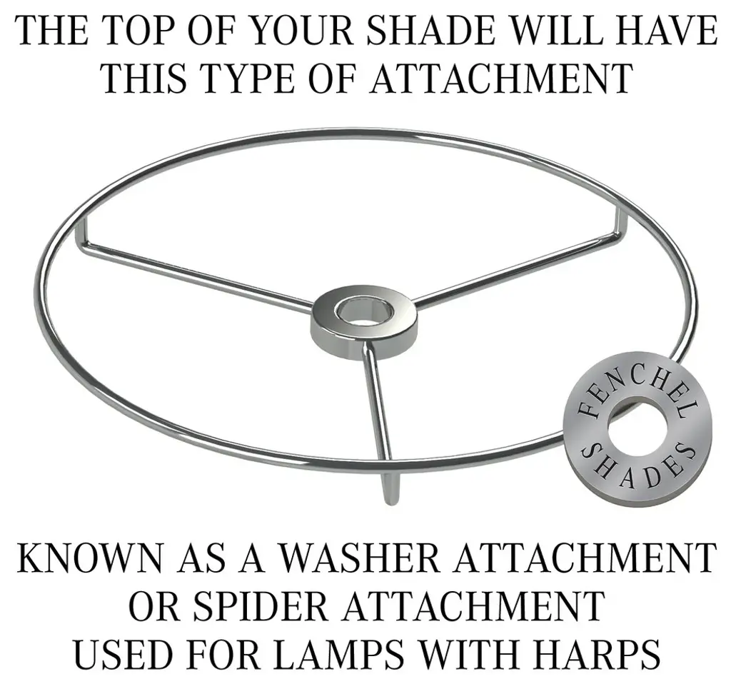 This lamp shade is made with pride in the USA, and construction does not begin until you place your order. This shade measures 5" Top Diameter x 12" Bottom Diameter x 9" Slant Height. The shade is equipped with a Nickel Finish Washer fitter. This is the most common fitter type. It consists of a small washer with an inner diameter hole size of approximately 1/2". The washer generally rests on the top of a metal harp above the light bulb and is held in place by a screw-on finial. The outside of the lamp shade has a fabric covering. The inside is a white styrene (white plastic). The top and bottom of this item is adorned with a 1/2" band of single fold lampshade trim. The trim is the same color as the covering.
