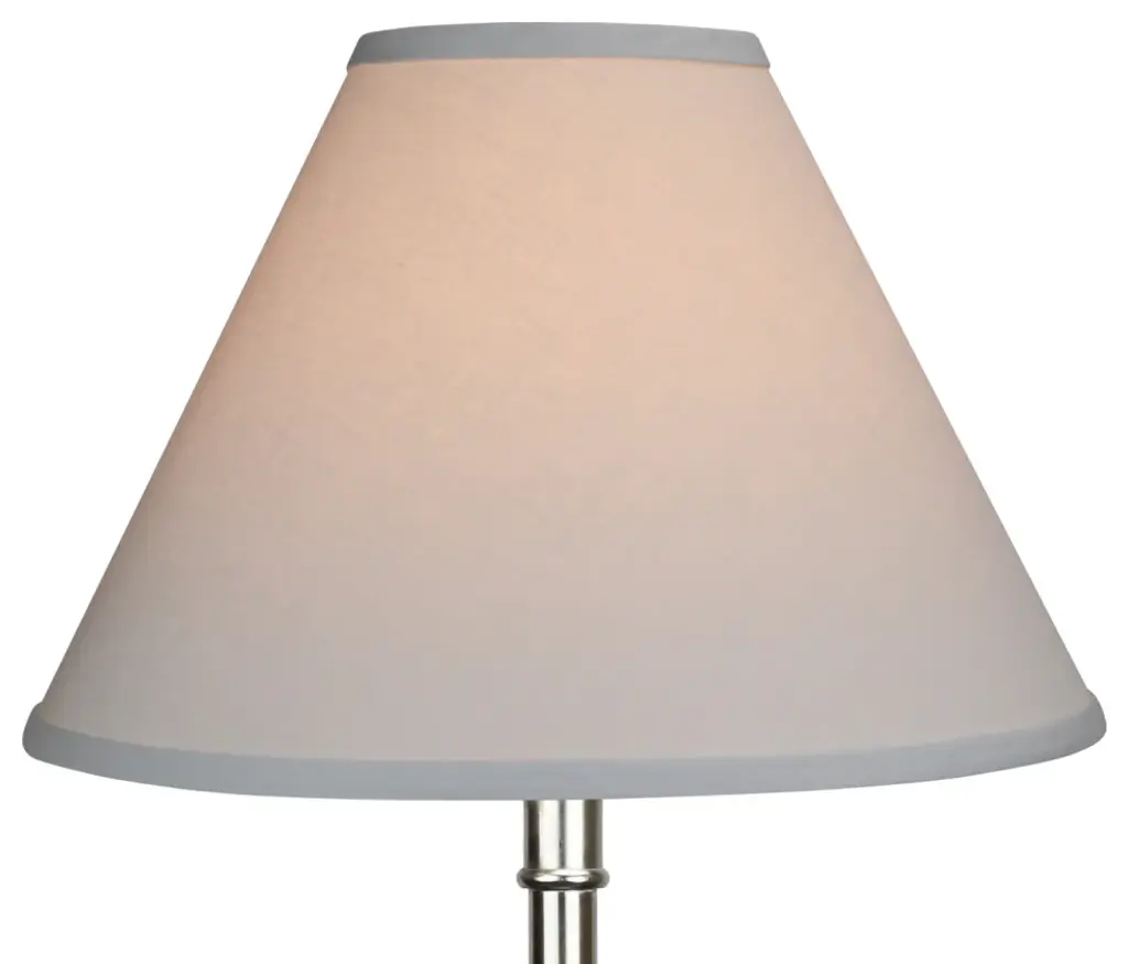 This Fenchel Shades lamp shade has a top diameter of 5 inches, a bottom diameter of 14 inches, and a slant height of 10 inches. The vertical height of this shade is about 9 inches. This attachment is called a washer attachment and is nickel in color. It is also known as a spider attachment. If your lamp has a harp, then you will generally need a washer attachment. The hole size (inner-dimension) of a washer attachment measures slightly under 1/2 inch. The drop on this particular attachment is 1/2 inch. That means, it recesses about 1/2 inch below the top of the lamp shade. This Product is proudly made in the USA with US materials.• First photo is to reference the style of shade, Second photo is the COLOR of the shade•