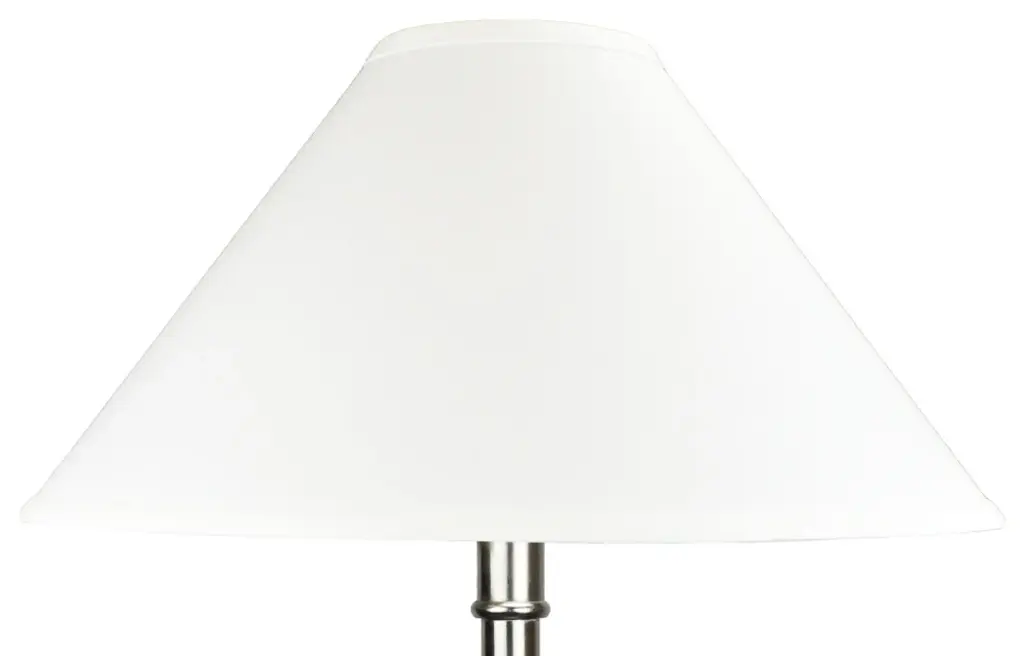 This Fenchel Shades lamp shade has a top diameter of 5 inches, a bottom diameter of 18 inches, and a slant height of 11 inches. The vertical height of this shade is about 8.75 inches. This attachment is called a washer attachment and is brass in color. It is also known as a spider attachment. If your lamp has a harp, then you will generally need a washer attachment. The hole size (inner-dimension) of a washer attachment measures slightly under 1/2 inch. This Product is proudly made in the USA with US materials.• First photo is to reference the style of shade, Second photo is the COLOR of the shade•