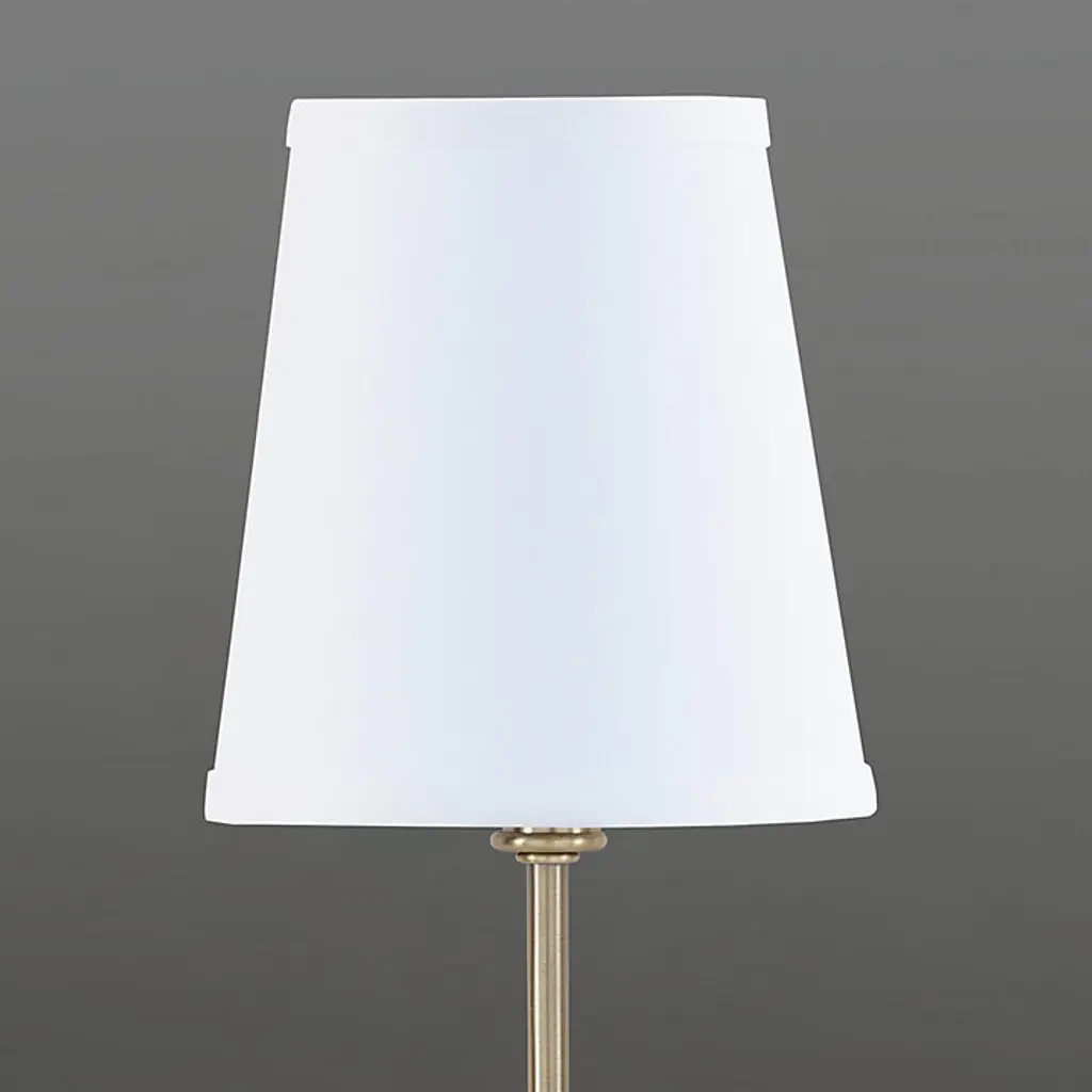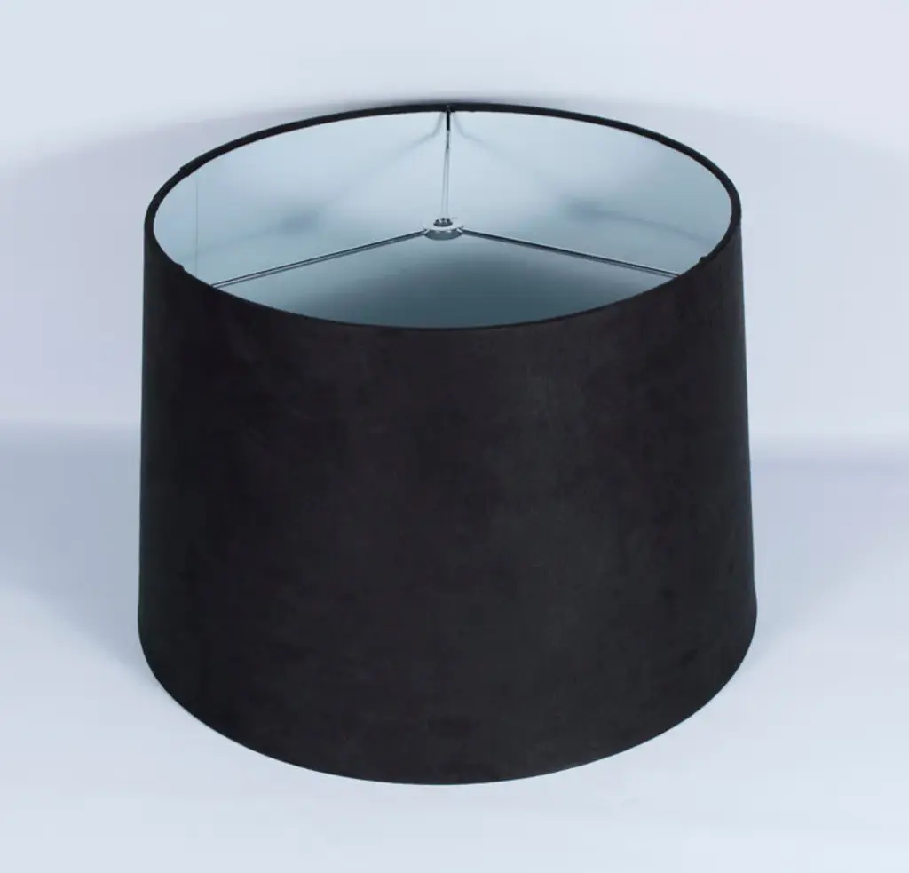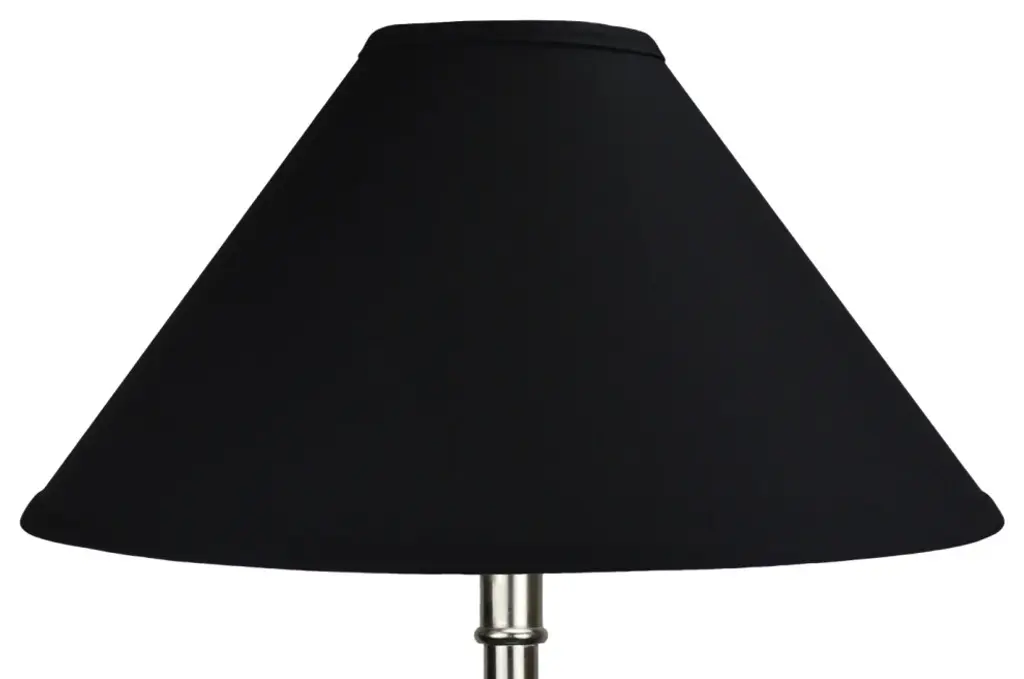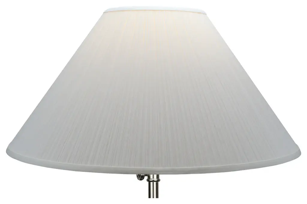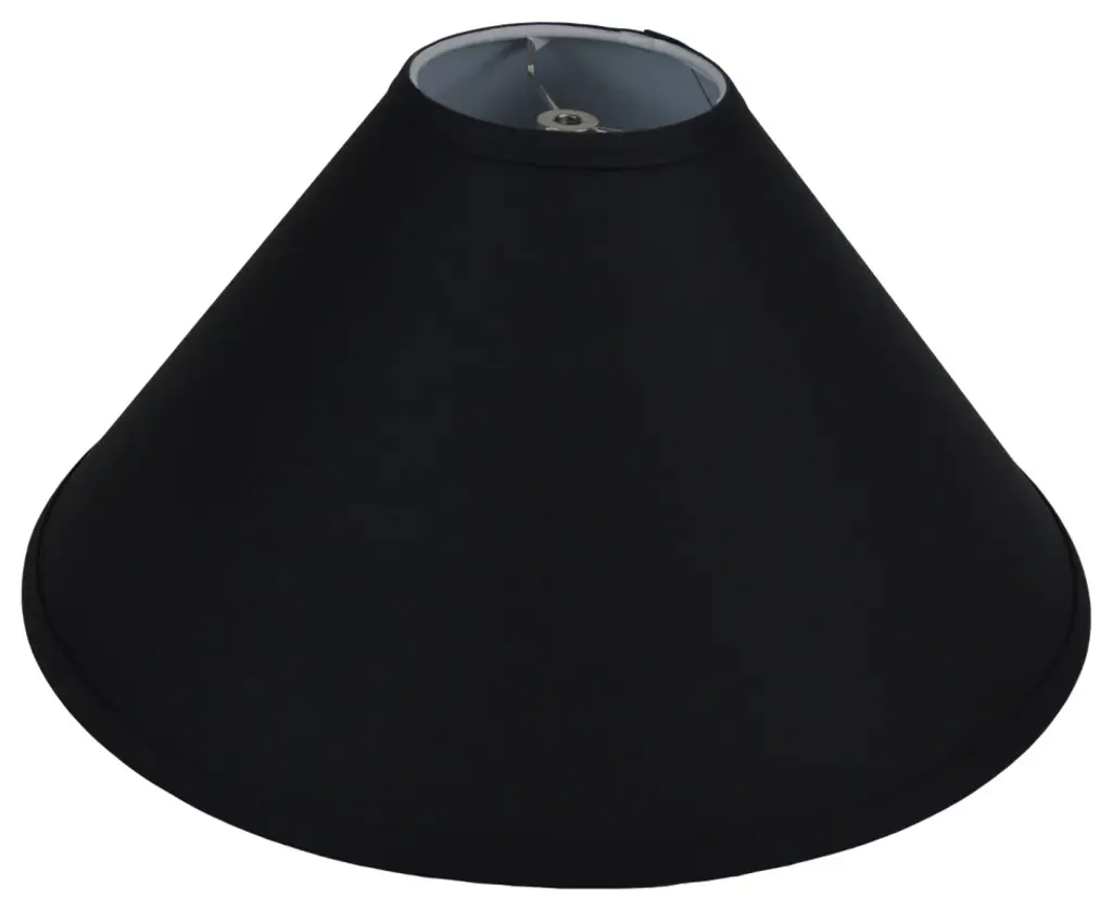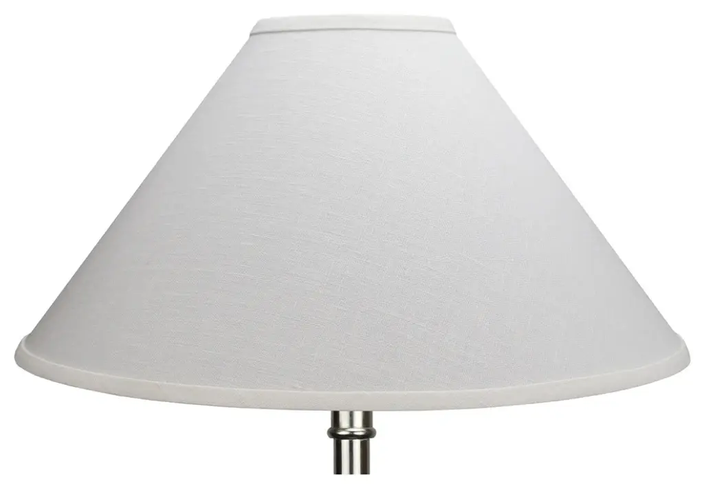 This lamp shade is hand made with pride in the USA, and construction does not begin until you place your order. This shade measures 5" Top Diameter x 18" Bottom Diameter x 11" Slant Height. The shade is equipped with a Nickel Finish Washer fitter. This is the most common fitter type. It consists of a small washer with an inner diameter hole size of approximately 1/2". The washer generally rests on the top of a metal harp above the light bulb and is held in place by a screw-on finial. The outside of the lamp shade has a fabric covering. The inside is a white styrene (white plastic). The top and bottom of this item is adorned with a 1/2" band of single fold lampshade trim. The trim is the same color as the covering.