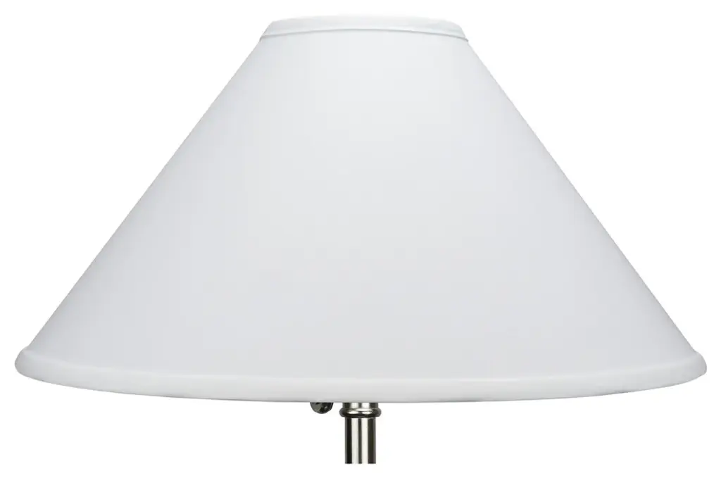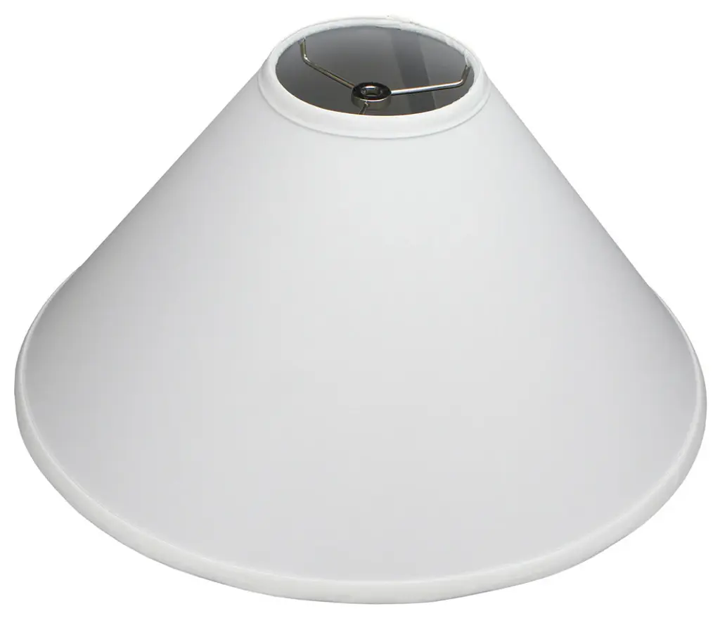 This lamp shade is hand made with pride in the USA, and construction does not begin until you place your order. This shade measures 5" Top Diameter x 18" Bottom Diameter x 11" Slant Height. The shade is equipped with a Nickel Finish Washer fitter. This is the most common fitter type. It consists of a small washer with an inner diameter hole size of approximately 1/2". The washer generally rests on the top of a metal harp above the light bulb and is held in place by a screw-on finial. The outside of the lamp shade has a fabric covering. The inside is a white styrene (white plastic). The top and bottom of this item is adorned with a 1/2" band of single fold lampshade trim. The trim is the same color as the covering.
