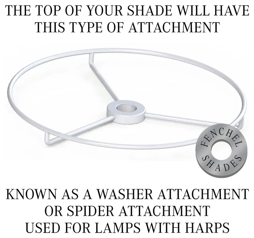 This Fenchel Shades lamp shade has a top diameter of 5 inches, a bottom diameter of 9 inches, and a slant height of 6 inches. The vertical height of this shade is about 5.75 inches. This attachment is called a washer attachment and is white in color. It is also known as a spider attachment. If your lamp has a harp, then you will generally need a washer attachment. The hole size (inner-dimension) of a washer attachment measures slightly under 1/2 inch. This Product is proudly made in the USA with US materials.• First photo is to reference the style of shade, Second photo is the COLOR of the shade•