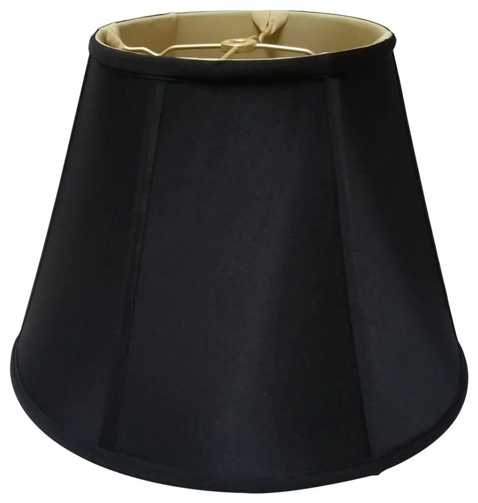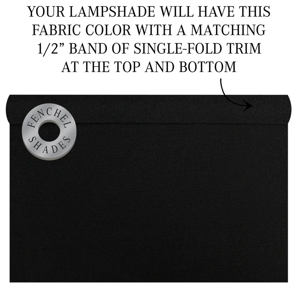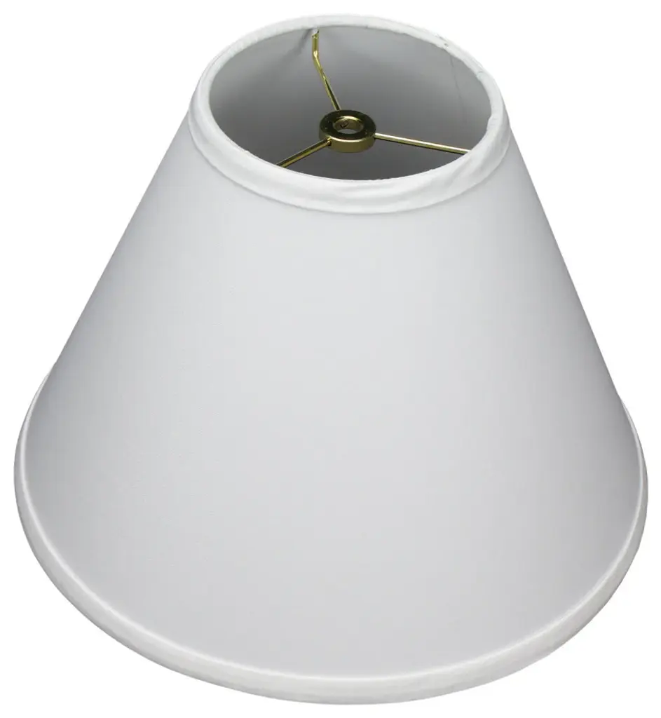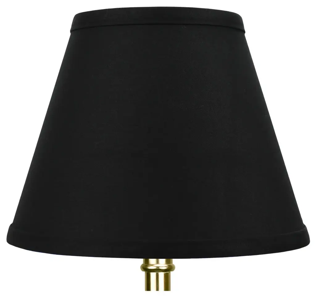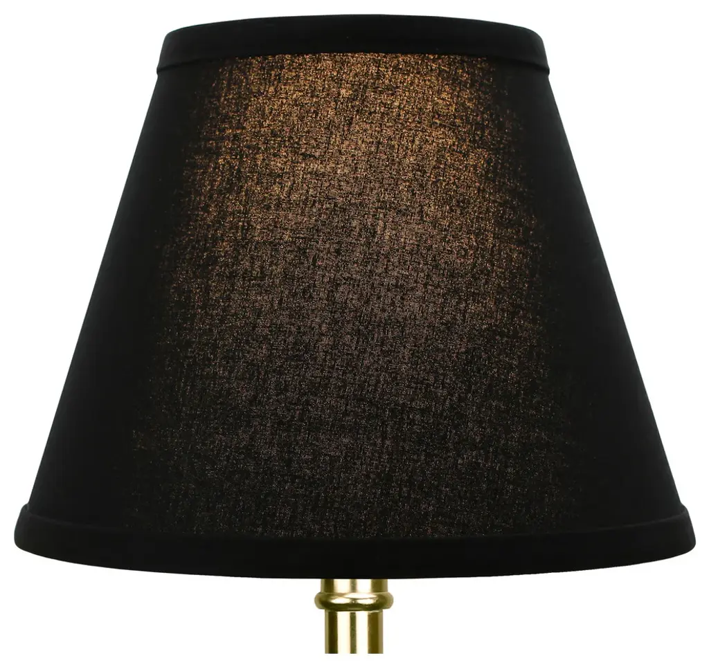 This lamp shade is made with pride in the USA, and construction does not begin until you place your order. This shade measures 5" Top Diameter x 9" Bottom Diameter x 7" Slant Height. The shade is equipped with a brass bulb-clip attachment. This lampshade clips on to an existing lamp with a standard styled light bulb. The bulb-clip attachment has a standard 1/2" drop, or recess, from the top of the shade. The outside of the lamp shade has a fabric covering. The inside is a white styrene (white plastic). The top and bottom of this item is adorned with a 1/2" band of single fold lampshade trim. The trim is the same color as the covering.