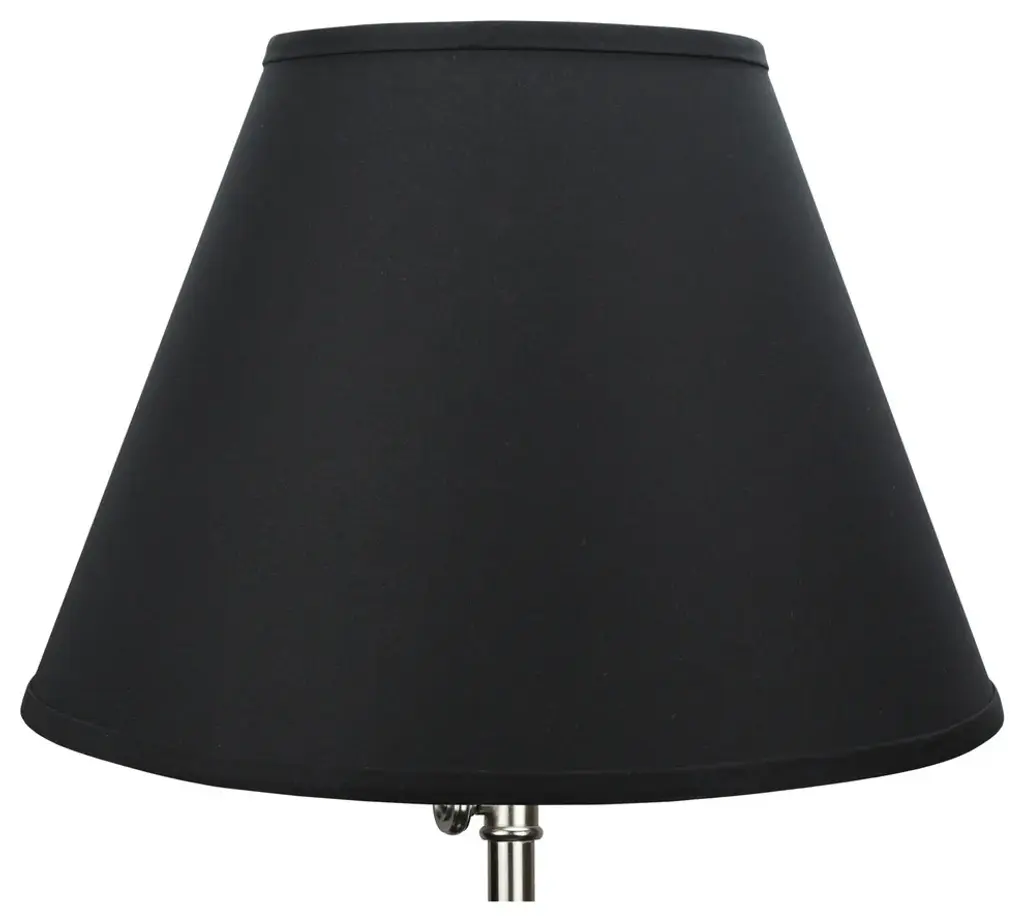 This Fenchel Shades lamp shade has a top diameter of 6.5 inches, a bottom diameter of 15 inches, and a slant height of 11 inches. The vertical height of this shade is about 10.25 inches. This attachment is called a washer attachment and is nickel in color. It is also known as a spider attachment. If your lamp has a harp, then you will generally need a washer attachment. The hole size (inner-dimension) of a washer attachment measures slightly under 1/2 inch. The drop on this particular attachment is 1/2 inch. That means, it recesses about 1/2 inch below the top of the lamp shade. This Product is proudly made in the USA with US materials.