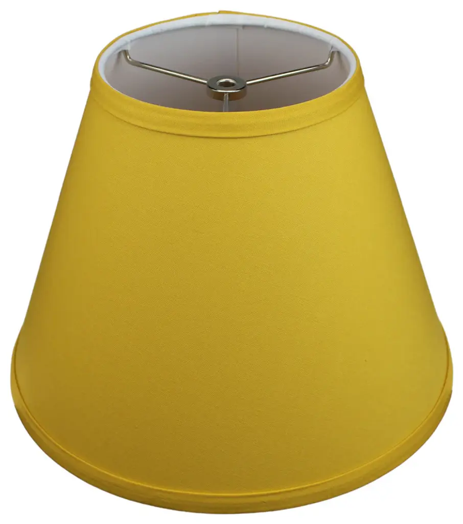 This lamp shade is made with pride in the USA, and construction does not begin until you place your order. This shade measures 6" Top Diameter x 11" Bottom Diameter x 9" Slant Height. The shade is equipped with a Nickel Finish Washer fitter. This is the most common fitter type. It consists of a small washer with an inner diameter hole size of approximately 1/2". The washer generally rests on the top of a metal harp above the light bulb and is held in place by a screw-on finial. The outside of the lamp shade has a fabric covering. The inside is a white styrene (white plastic). The top and bottom of this item is adorned with a 1/2" band of single fold lampshade trim. The trim is the same color as the covering.