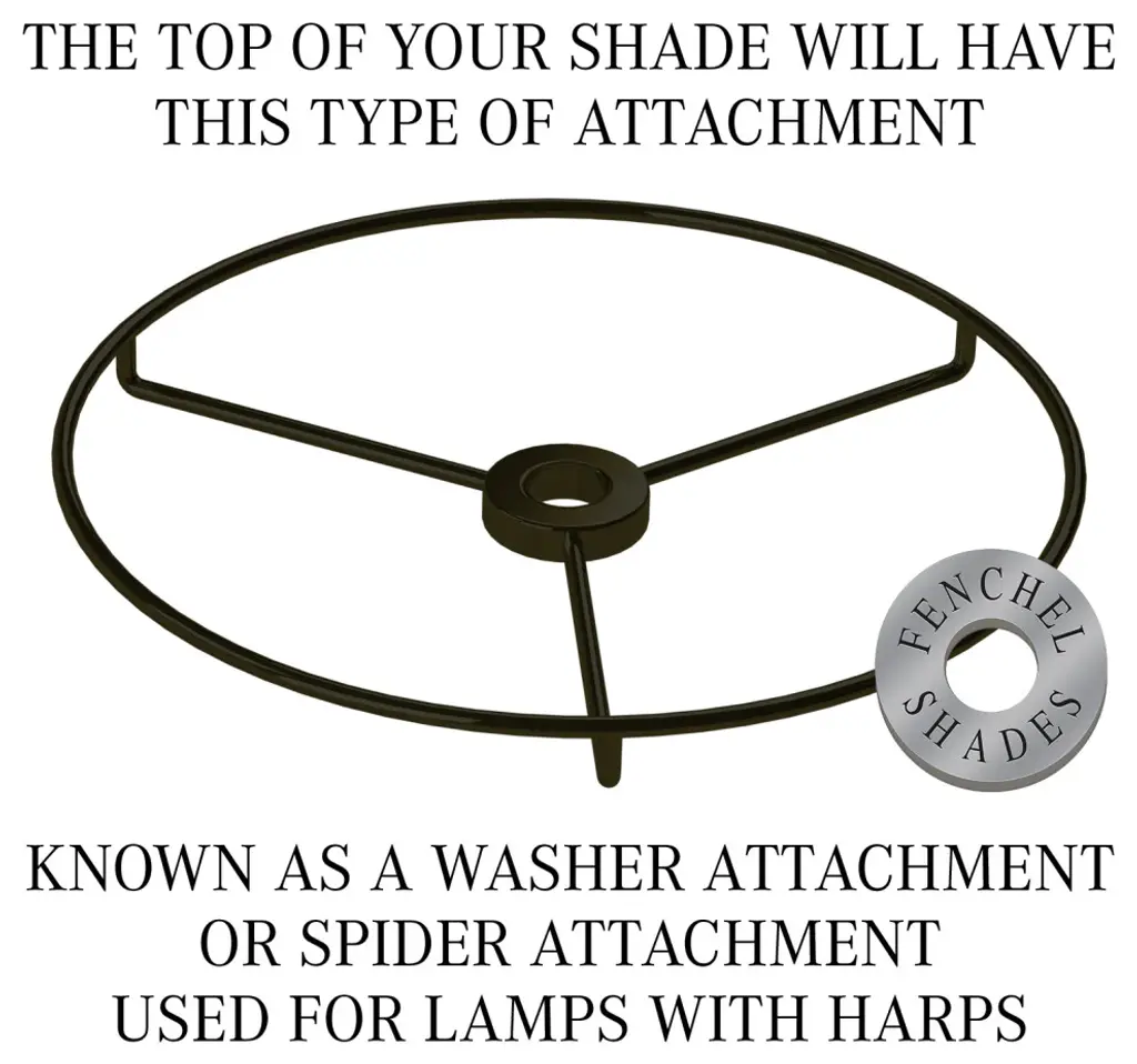 This Fenchel Shades lamp shade has a top diameter of 6 inches, a bottom diameter of 12 inches, and a slant height of 8 inches. The vertical height of this shade is about 7.5 inches. This attachment is called a washer attachment and is painted a dark, oil-rubbed bronze color. It is also known as a spider attachment. If your lamp has a harp, then you will generally need a washer attachment. The hole size (inner-dimension) of a washer attachment measures slightly under 1/2 inch. This Product is proudly made in the USA with US materials.
