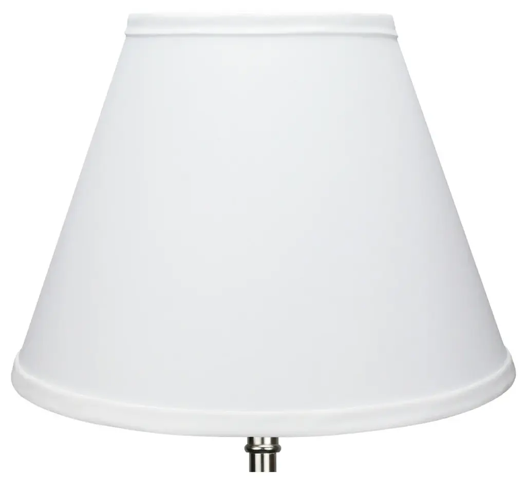This lamp shade is made with pride in the USA, and construction does not begin until you place your order. This shade is equipped with a Nickel Finish Washer fitter. This is the most common fitter type. It consists of a small washer with an inner diameter hole size of approximately 1/2". The washer generally rests on the top of a metal harp above the light bulb and is held in place by a screw-on finial. The outside of the lamp shade has a fabric covering. The inside is a white styrene (white plastic). The top and bottom of this item is adorned with a 1/2" band of single fold lampshade trim. The trim is the same color as the covering.