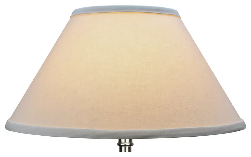 This lamp shade is made with pride in the USA, and construction does not begin until you place your order. This shade measures 6" Top Diameter x 14" Bottom Diameter x 8" Slant Height. The shade is equipped with a Nickel Finish Washer fitter. This is the most common fitter type. It consists of a small washer with an inner diameter hole size of approximately 1/2". The washer generally rests on the top of a metal harp above the light bulb and is held in place by a screw-on finial. The outside of the lamp shade has a fabric covering. The inside is a white styrene (white plastic). The top and bottom of this item is adorned with a 1/2" band of single fold lampshade trim. The trim is the same color as the covering.