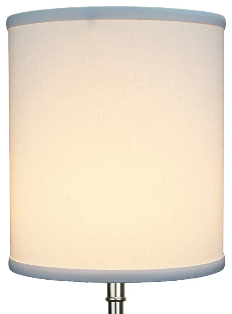This Fenchel Shades lamp shade has a top diameter of 6 inches, a bottom diameter of 6 inches, and a slant height of 7 inches. The vertical height of this shade is about 7 inches. This attachment is called a washer attachment and is nickel in color. It is also known as a spider attachment. If your lamp has a harp, then you will generally need a washer attachment. The hole size (inner-dimension) of a washer attachment measures slightly under 1/2 inch. The drop on this particular attachment is 1/2 inch. That means, it recesses about 1/2 inch below the top of the lamp shade. This Product is proudly made in the USA with US materials.