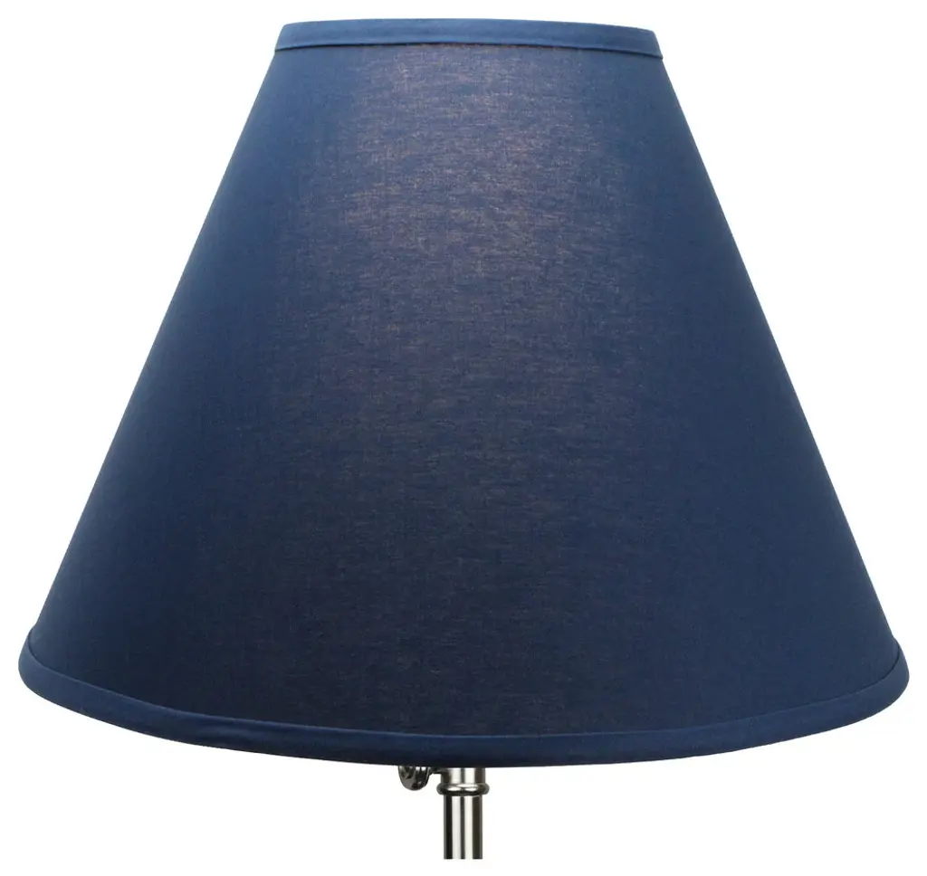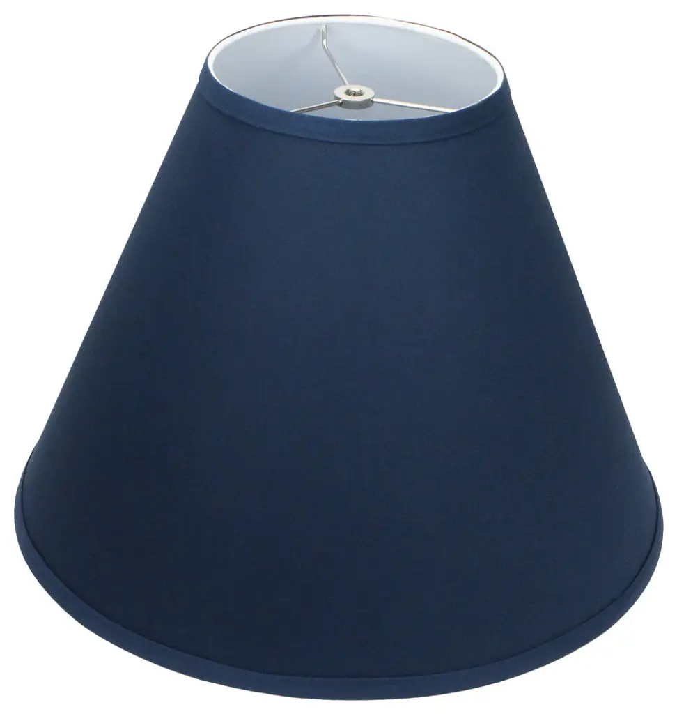 This lamp shade is made with pride in the USA, and construction does not begin until you place your order. This shade measures 7" Top Diameter x 17" Bottom Diameter x 13" Slant Height. The shade is equipped with a Nickel Finish Washer fitter. This is the most common fitter type. It consists of a small washer with an inner diameter hole size of approximately 1/2". The washer generally rests on the top of a metal harp above the light bulb and is held in place by a screw-on finial. The outside of the lamp shade has a fabric covering. The inside is a white styrene (white plastic). The top and bottom of this item is adorned with a 1/2" band of single fold lampshade trim. The trim is the same color as the covering.