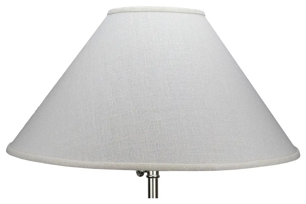 This lamp shade is made with pride in the USA, and construction does not begin until you place your order. This shade measures 7" Top Diameter x 22" Bottom Diameter x 13" Slant Height. This shade is equipped with a nickel finish washer fitter. This is the most common fitter type. It consists of a small washer with an inner diameter hole size of approximately 1/2". The washer generally rests on the top of a metal harp above the light bulb and is held in place by a screw-on finial. The outside of the lamp shade has a fabric covering. The inside is a white styrene (white plastic). The top and bottom of this item is adorned with a 1/2" band of single fold lampshade trim. The trim is the same color as the covering.