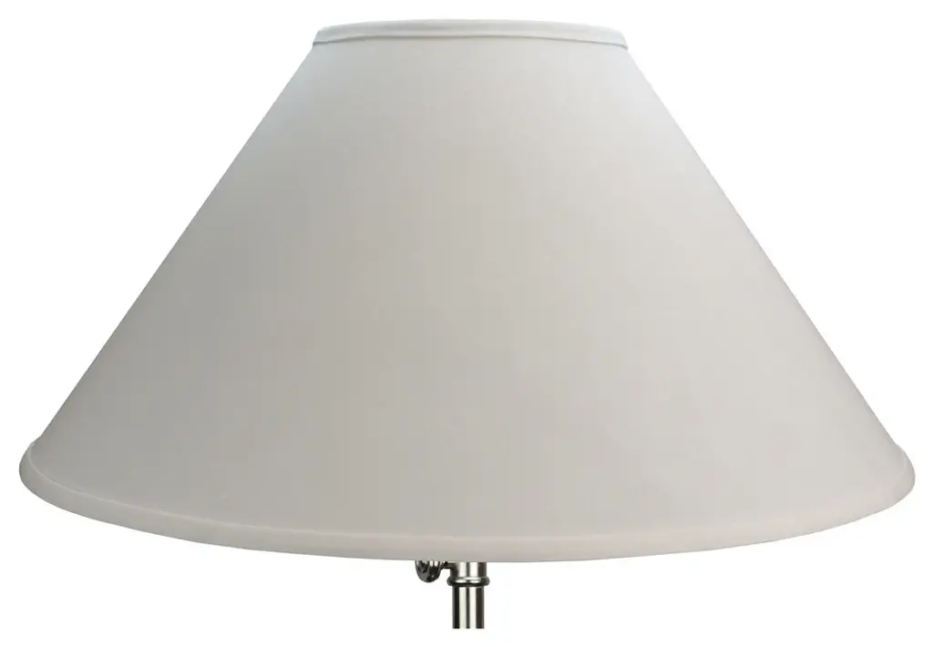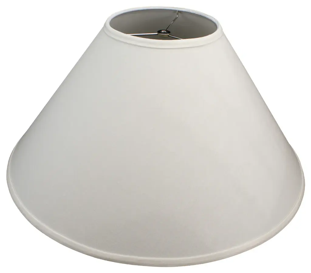 This lamp shade is made with pride in the USA, and construction does not begin until you place your order. This shade measures 8" Top Diameter x 24" Bottom Diameter x 14" Slant Height. The shade is equipped with a Nickel Finish Washer fitter. This is the most common fitter type. It consists of a small washer with an inner diameter hole size of approximately 1/2". The washer generally rests on the top of a metal harp above the light bulb and is held in place by a screw-on finial. The outside of the lamp shade has a fabric covering. The inside is a white styrene (white plastic). The top and bottom of this item is adorned with a 1/2" band of single fold lampshade trim. The trim is the same color as the covering.