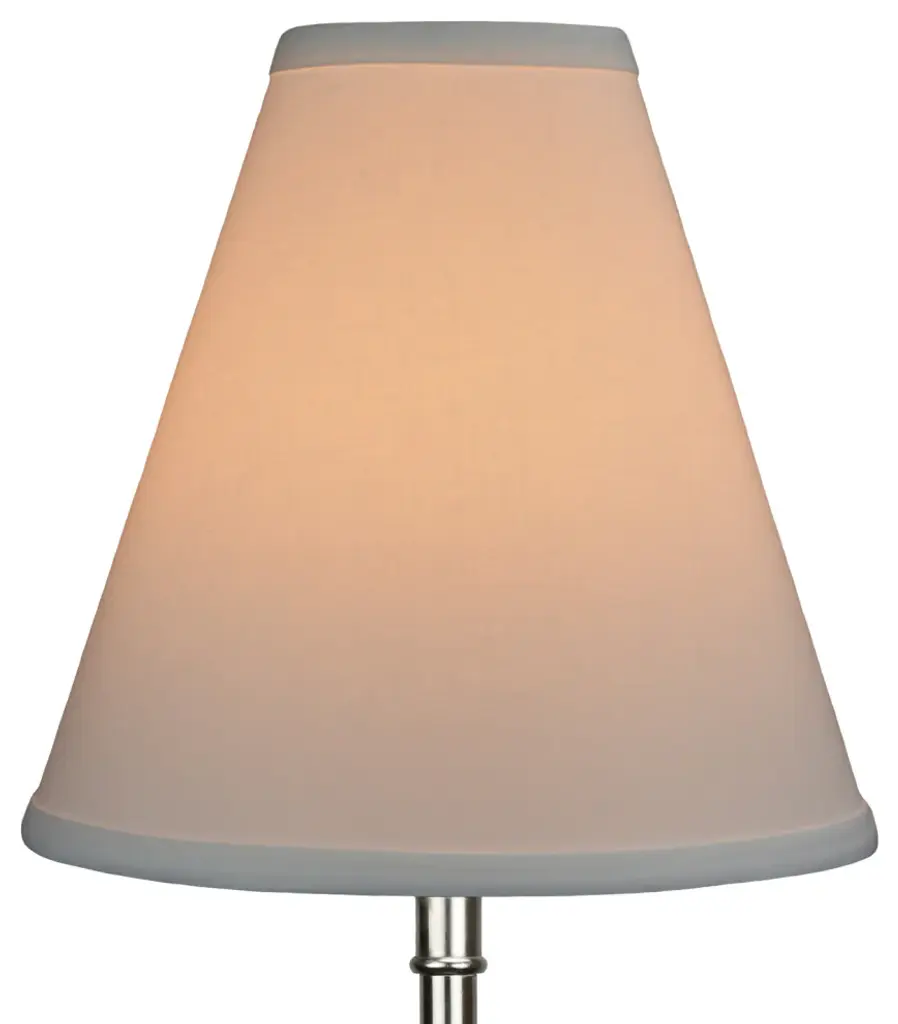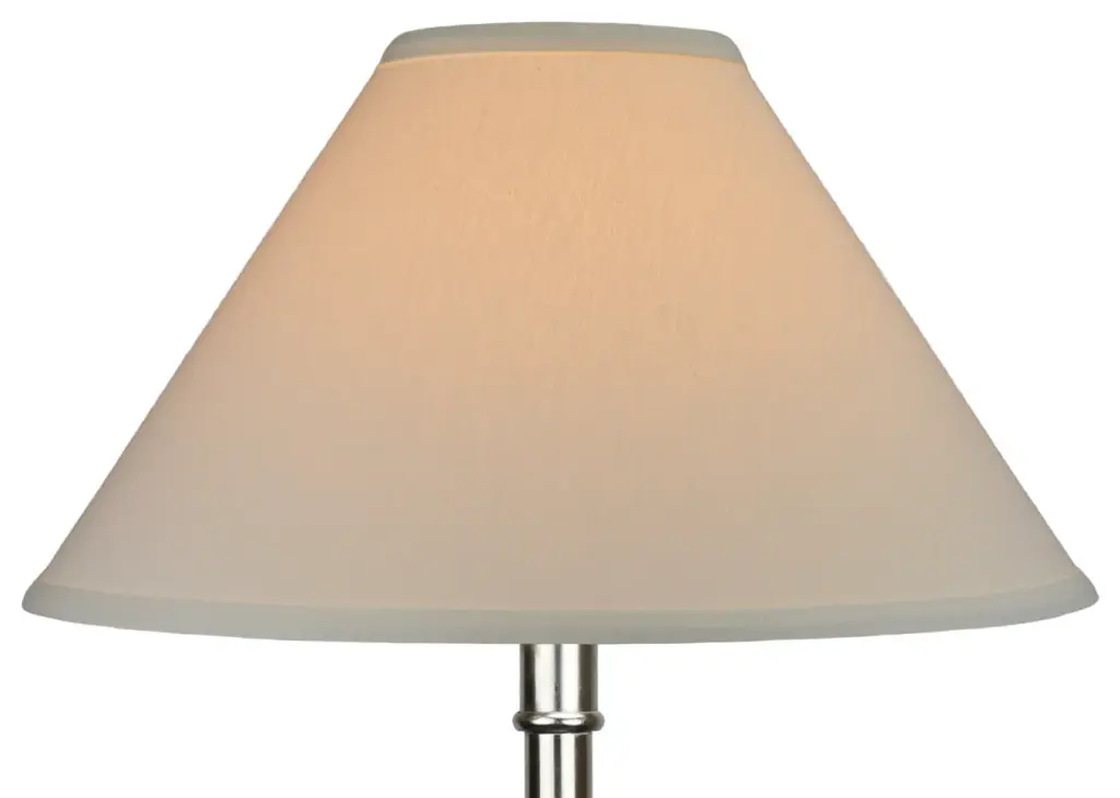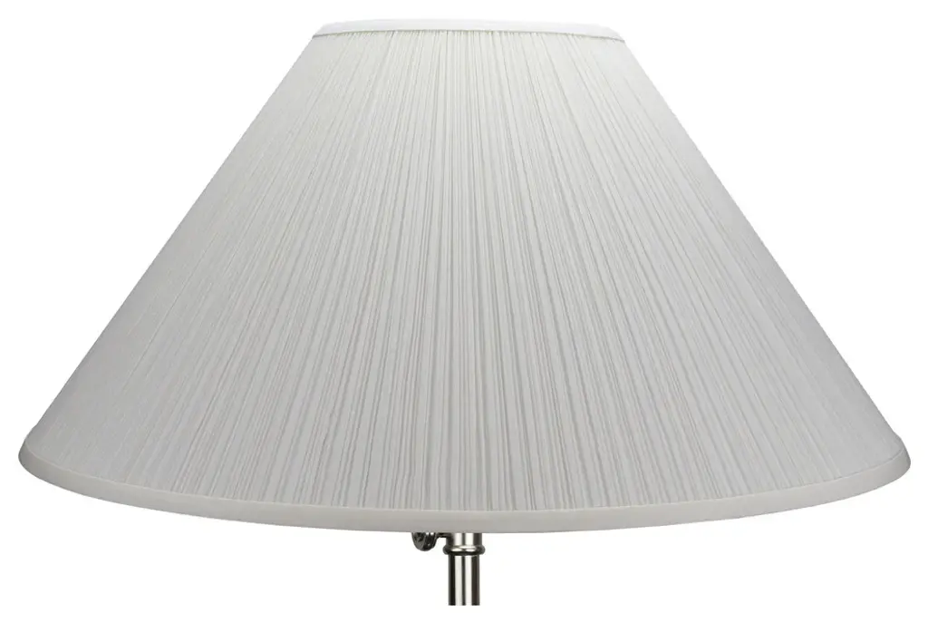 This lamp shade is made with pride in the USA, and construction does not begin until you place your order. This shade measures 8" Top Diameter x 24" Bottom Diameter x 14" Slant Height. The shade is equipped with a Nickel Finish Washer fitter. This is the most common fitter type. It consists of a small washer with an inner diameter hole size of approximately 1/2". The washer generally rests on the top of a metal harp above the light bulb and is held in place by a screw-on finial. The outside of the lamp shade has a fabric covering. The inside is a white styrene (white plastic). The top and bottom of this item is adorned with a 1/2" band of single fold lampshade trim. The trim is the same color as the covering.