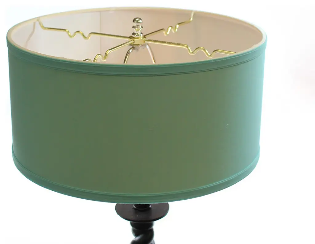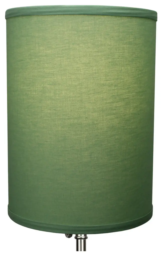 This lamp shade is made with pride in the USA, and construction does not begin until you place your order. This shade measures 8" Top Diameter x 8" Bottom Diameter x 11" Height. This shade is equipped with a nickel finish washer fitter. This is the most common fitter type. It consists of a small washer with an inner diameter hole size of approximately 1/2". The washer generally rests on the top of a metal harp above the light bulb and is held in place by a screw-on finial. The outside of the lamp shade has a fabric covering. The inside is a white styrene (white plastic). The top and bottom of this item is adorned with a 1/2" band of single fold lampshade trim. The trim is the same color as the covering.