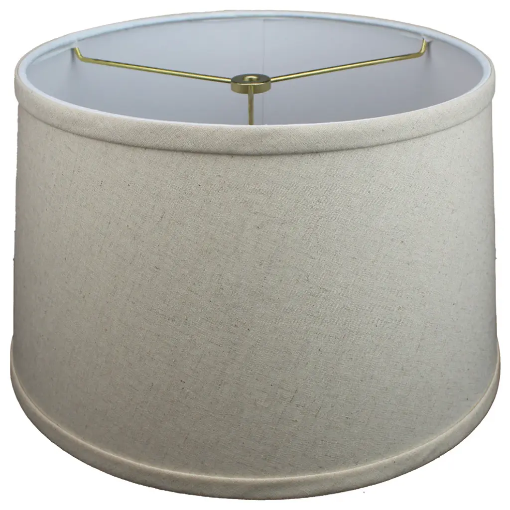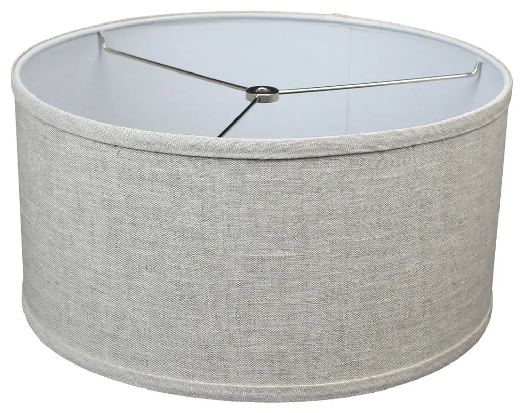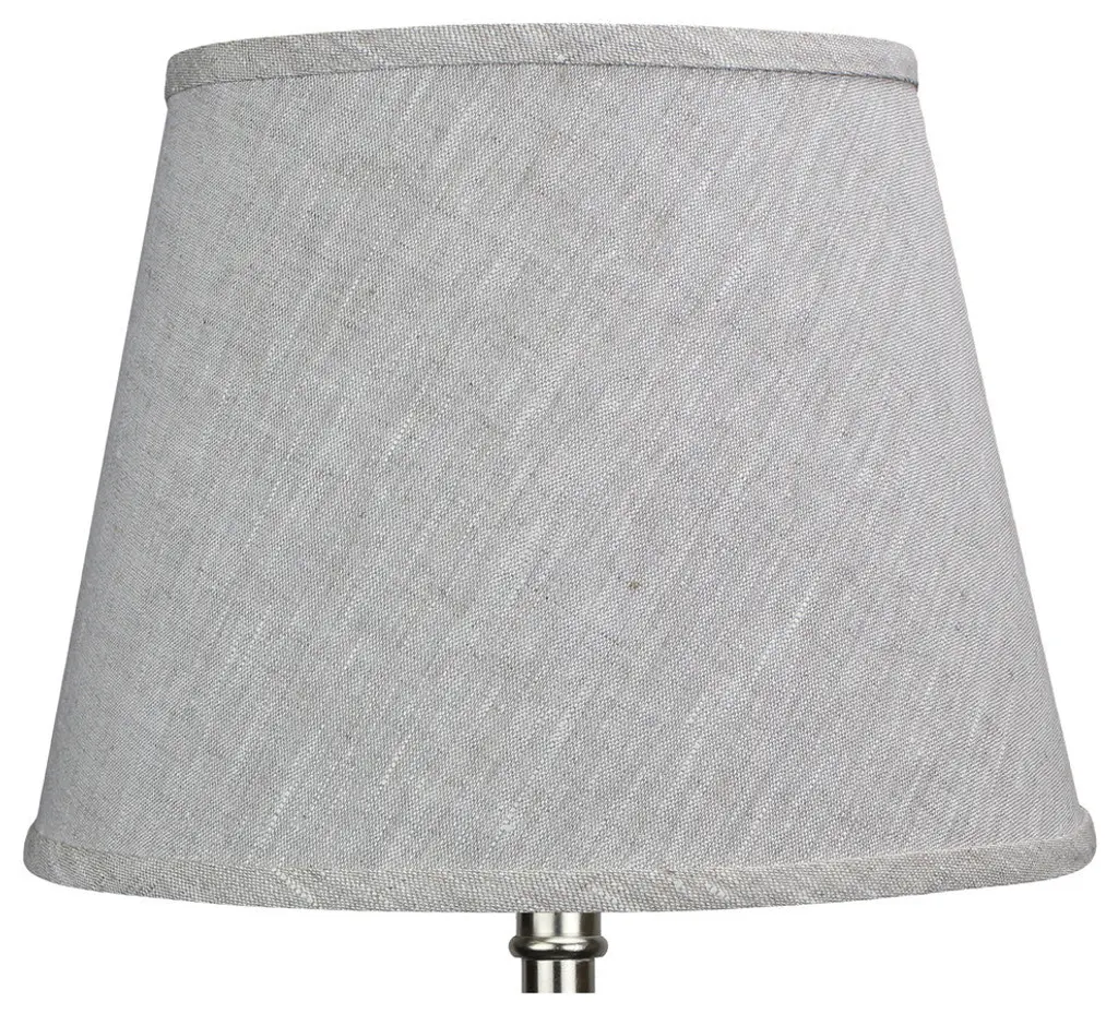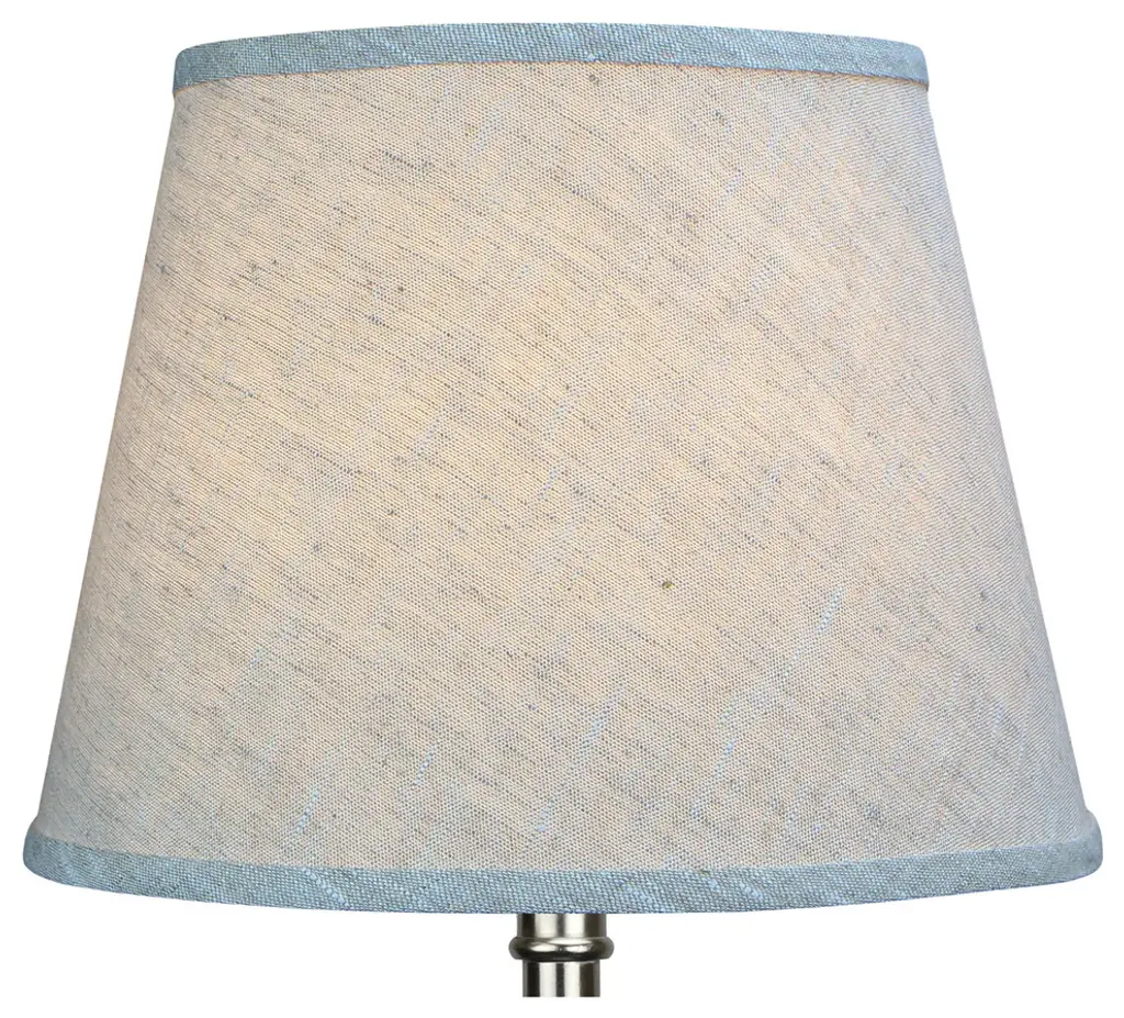 This lamp shade is made with pride in the USA, and construction does not begin until you place your order. This shade measures 9" Top Diameter x 13" Bottom Diameter x 10" Slant Height. The shade is equipped with a Nickel Finish Washer fitter. This is the most common fitter type. It consists of a small washer with an inner diameter hole size of approximately 1/2". The washer generally rests on the top of a metal harp above the light bulb and is held in place by a screw-on finial. The outside of the lamp shade has a fabric covering. The inside is a white styrene (white plastic). The top and bottom of this item is adorned with a 1/2" band of single fold lampshade trim. The trim is the same color as the covering.