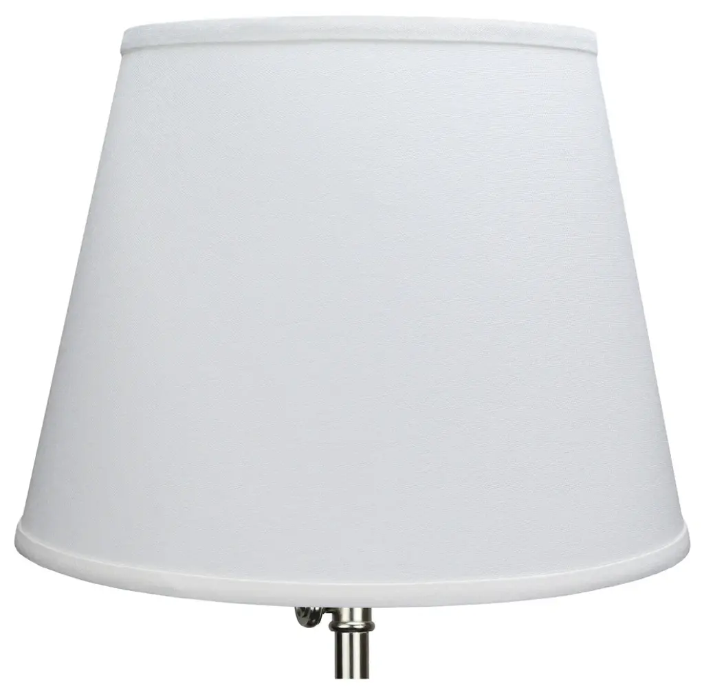 This lamp shade is made with pride in the USA, and construction does not begin until you place your order. This shade measures 9" Top Diameter x 13" Bottom Diameter x 10" Slant Height. The shade is equipped with a Nickel Finish Washer fitter. This is the most common fitter type. It consists of a small washer with an inner diameter hole size of approximately 1/2". The washer generally rests on the top of a metal harp above the light bulb and is held in place by a screw-on finial. The outside of the lamp shade has a fabric covering. The inside is a white styrene (white plastic). The top and bottom of this item is adorned with a 1/2" band of single fold lampshade trim. The trim is the same color as the covering.