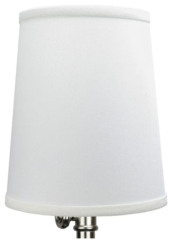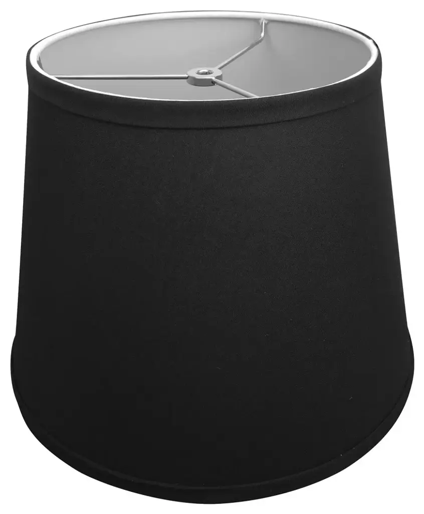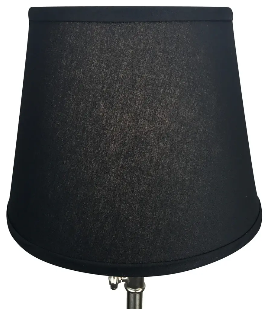 This lamp shade is made with pride in the USA, and construction does not begin until you place your order. This shade measures 9" Top Diameter x 13" Bottom Diameter x 10" Slant Height. The shade is equipped with a Nickel Finish Washer fitter. This is the most common fitter type. It consists of a small washer with an inner diameter hole size of approximately 1/2". The washer generally rests on the top of a metal harp above the light bulb and is held in place by a screw-on finial. The outside of the lamp shade has a fabric covering. The inside is a white styrene (white plastic). The top and bottom of this item is adorned with a 1/2" band of single fold lampshade trim. The trim is the same color as the covering.