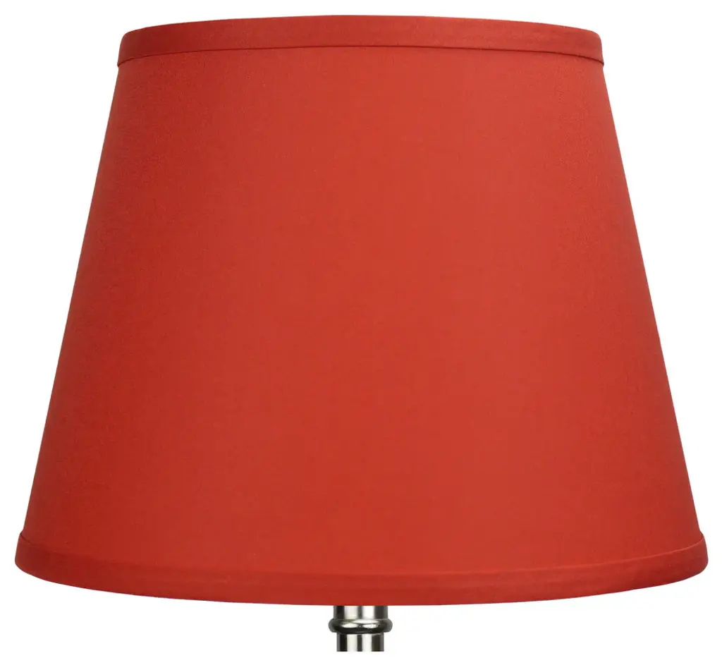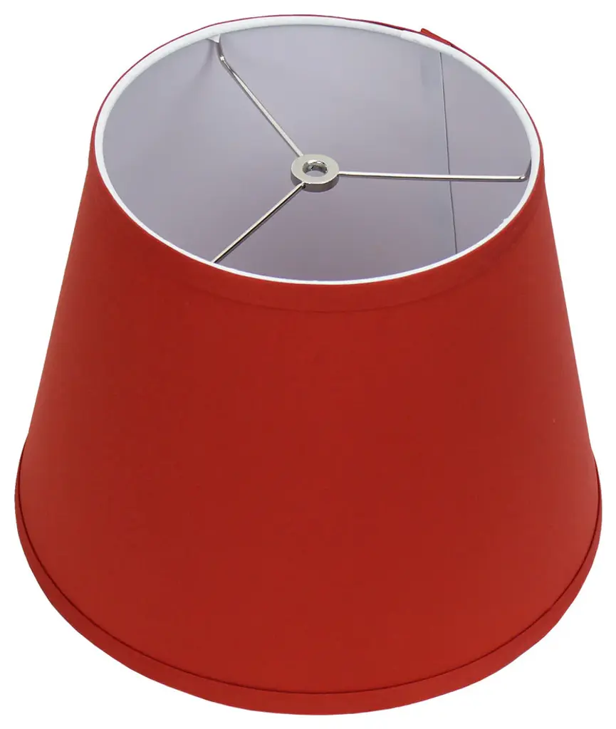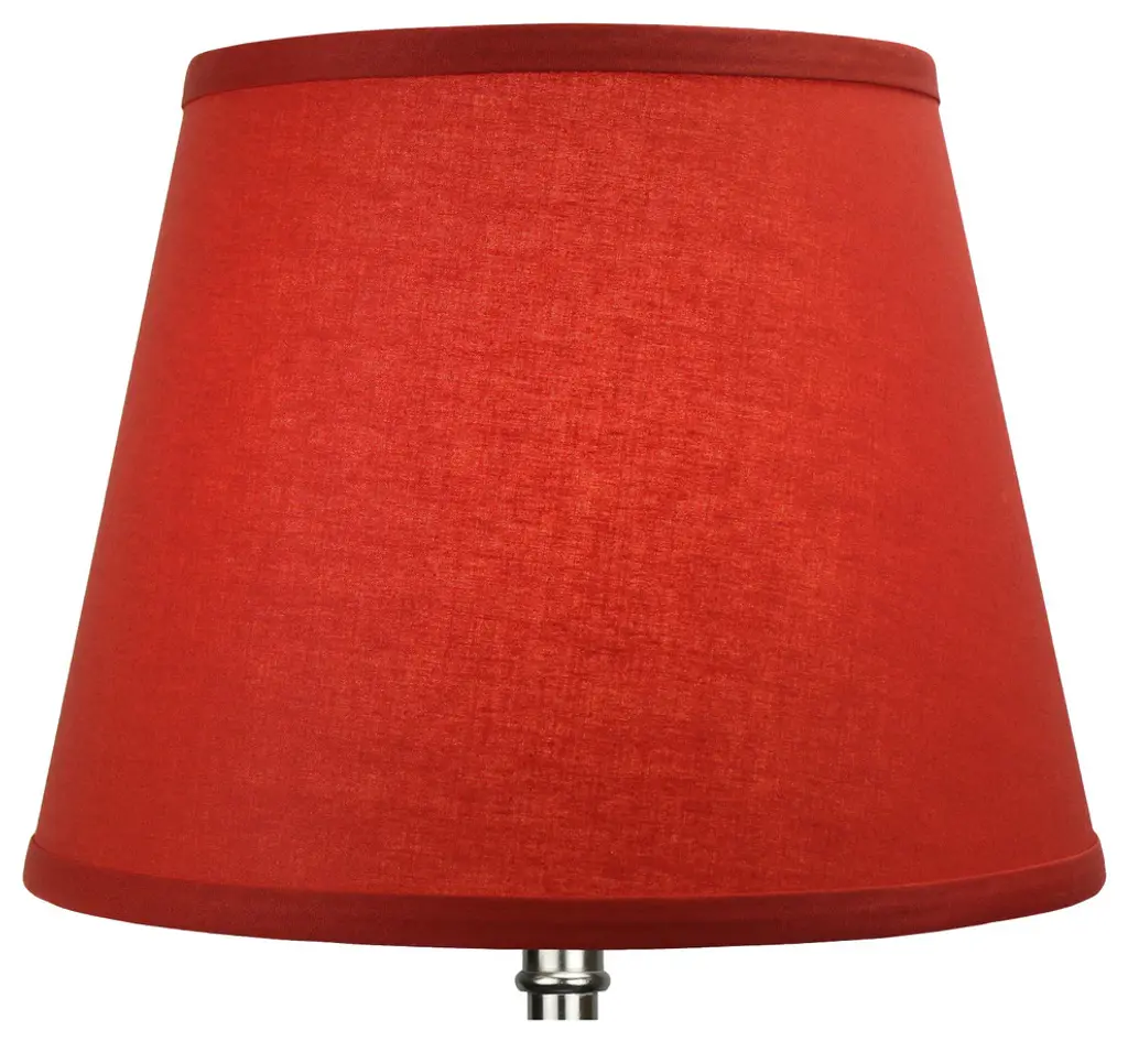 This lamp shade is made with pride in the USA, and construction does not begin until you place your order. This shade measures 9" Top Diameter x 13" Bottom Diameter x 10" Slant Height. The shade is equipped with a Nickel Finish Washer fitter. This is the most common fitter type. It consists of a small washer with an inner diameter hole size of approximately 1/2". The washer generally rests on the top of a metal harp above the light bulb and is held in place by a screw-on finial. The outside of the lamp shade has a fabric covering. The inside is a white styrene (white plastic). The top and bottom of this item is adorned with a 1/2" band of single fold lampshade trim. The trim is the same color as the covering.