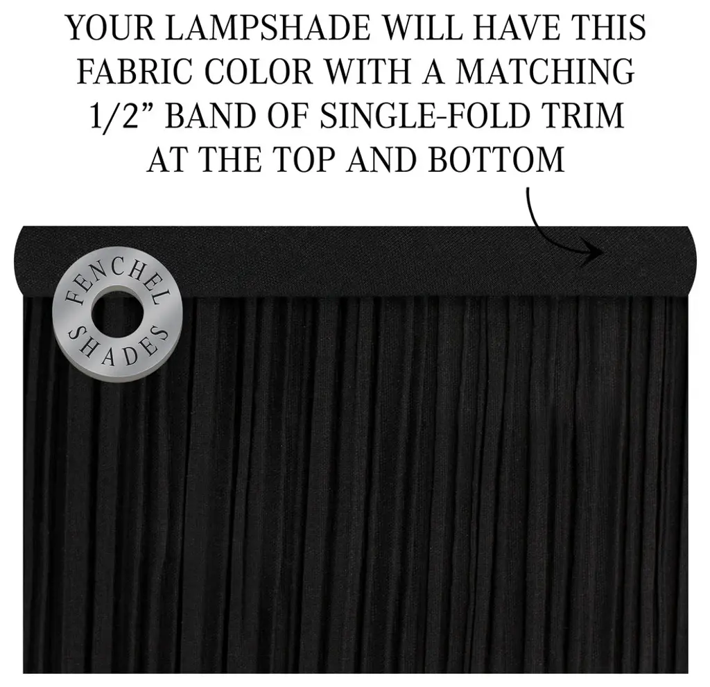 This lamp shade is made with pride in the USA, and construction does not begin until you place your order. This shade measures 9" Top Diameter x 18" Bottom Diameter x 13" Slant Height. This shade is equipped with a nickel finish washer fitter. This is the most common fitter type. It consists of a small washer with an inner diameter hole size of approximately 1/2". The washer generally rests on the top of a metal harp above the light bulb and is held in place by a screw-on finial. The outside of the lamp shade has a fabric covering. The inside is a white styrene (white plastic). The top and bottom of this item is adorned with a 1/2" band of single fold lampshade trim. The trim is the same color as the covering.
