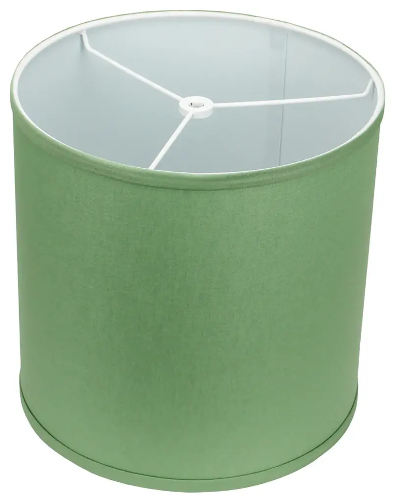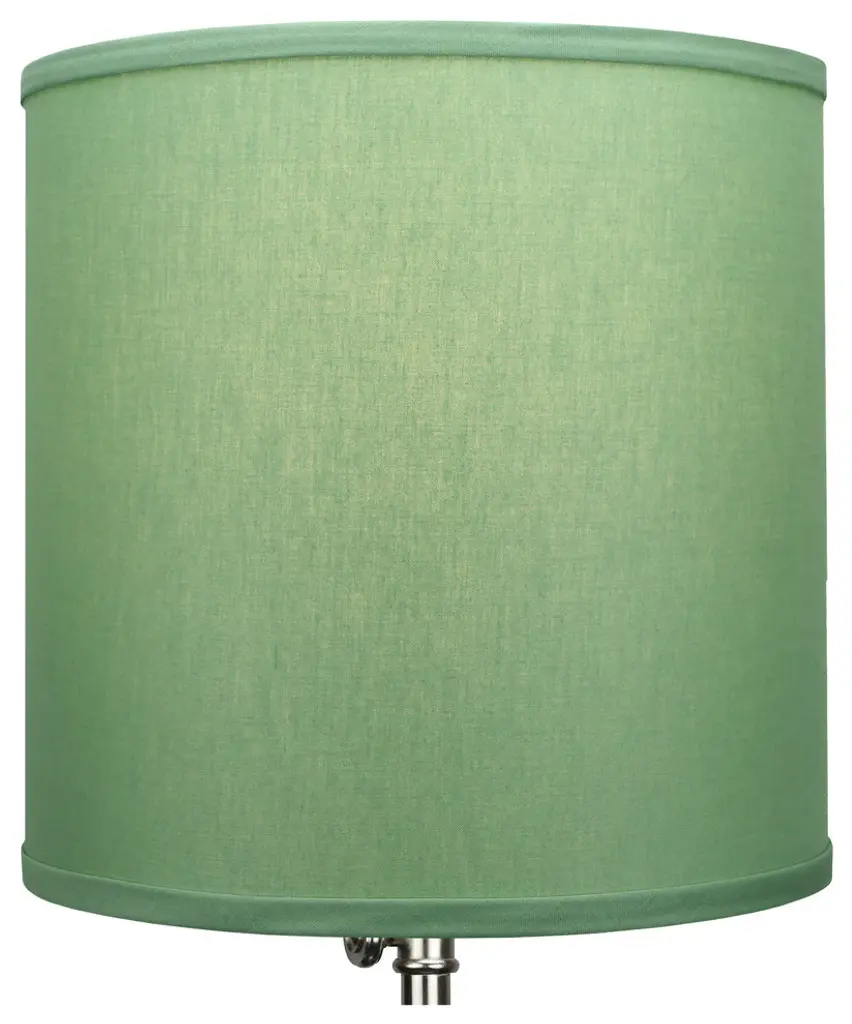 This lamp shade is made with pride in the USA, and construction does not begin until you place your order. This shade is equipped with a white finish washer fitter. This is the most common fitter type. It consists of a small washer with an inner diameter hole size of approximately 1/2". The washer generally rests on the top of a metal harp above the light bulb and is held in place by a screw-on finial. The outside of the lamp shade has a linen fabric covering. Linen Celadon is a light green fabric. The inside is a white styrene (white plastic). The top and bottom of this item is adorned with a 1/2" band of single fold lampshade trim. The trim is the same color as the covering.