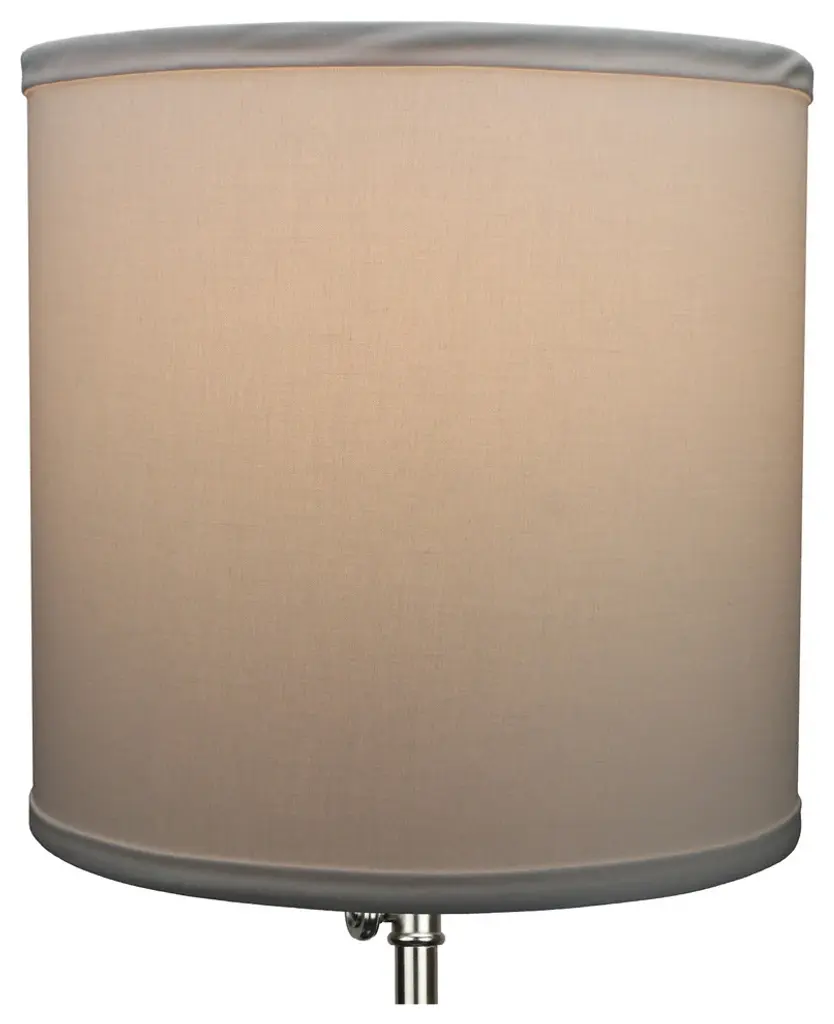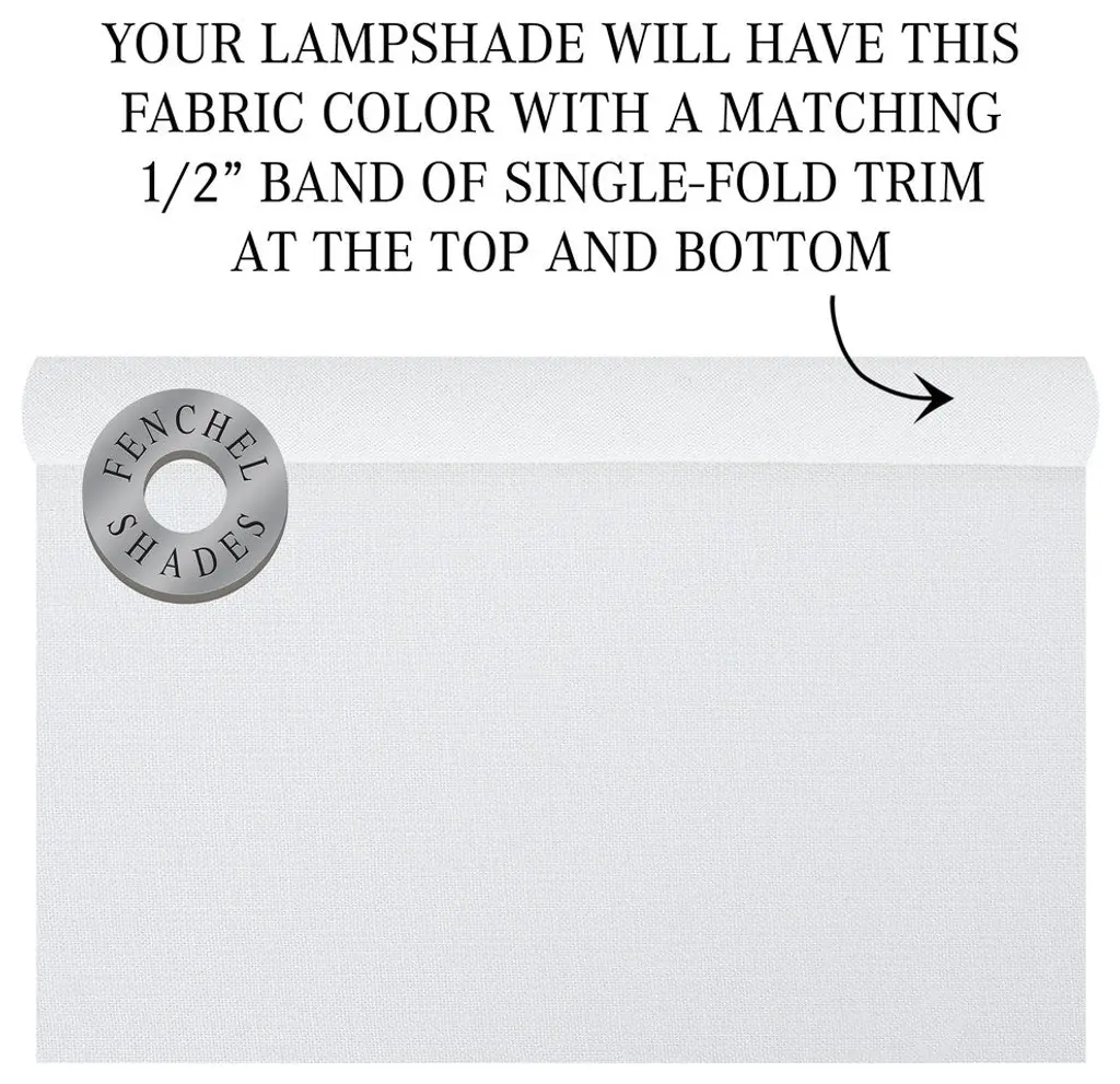 This lamp shade is made with pride in the USA, and construction does not begin until you place your order. This shade measures 10.5" Top Diameter x 10.5" Bottom Diameter x 10.5" Height. This shade is equipped with a nickel finish washer fitter. This is the most common fitter type. It consists of a small washer with an inner diameter hole size of approximately 1/2". The washer generally rests on the top of a metal harp above the light bulb and is held in place by a screw-on finial. The outside of the lamp shade has a fabric covering. The inside is a white styrene (white plastic). The top and bottom of this item is adorned with a 1/2" band of single fold lampshade trim. The trim is the same color as the covering.