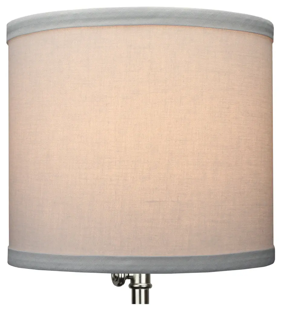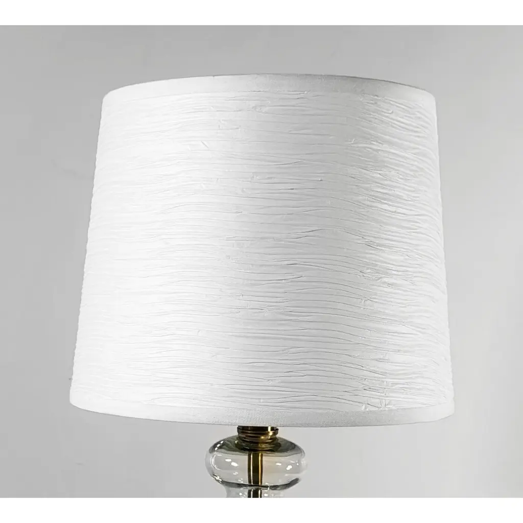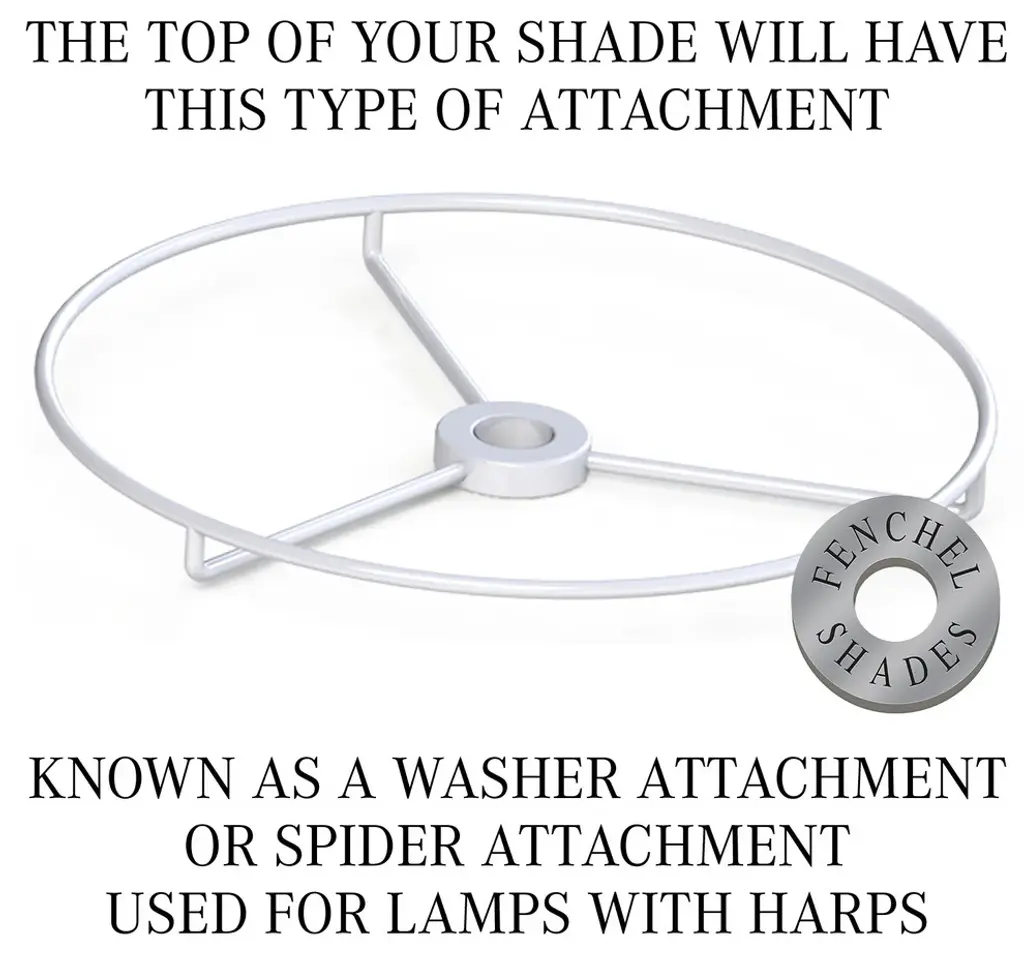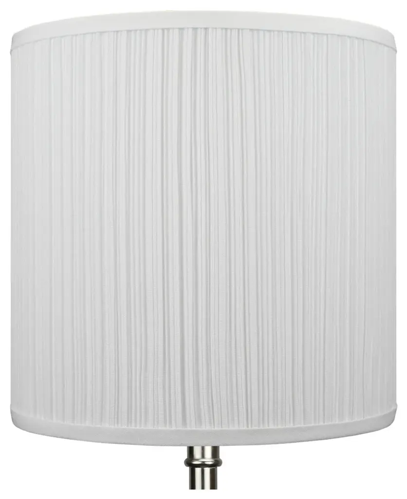 This lamp shade is made with pride in the USA, and construction does not begin until you place your order. This shade is equipped with a white finish washer fitter. This is the most common fitter type. It consists of a small washer with an inner diameter hole size of approximately 1/2". The washer generally rests on the top of a metal harp above the light bulb and is held in place by a screw-on finial. The outside of the lamp shade has a fabric covering. Pleated Mushroom White is a pleated bright white fabric. The inside is a white styrene (white plastic). The top and bottom of this item is adorned with a 1/2" band of single fold lampshade trim. The trim is the same color as the covering.