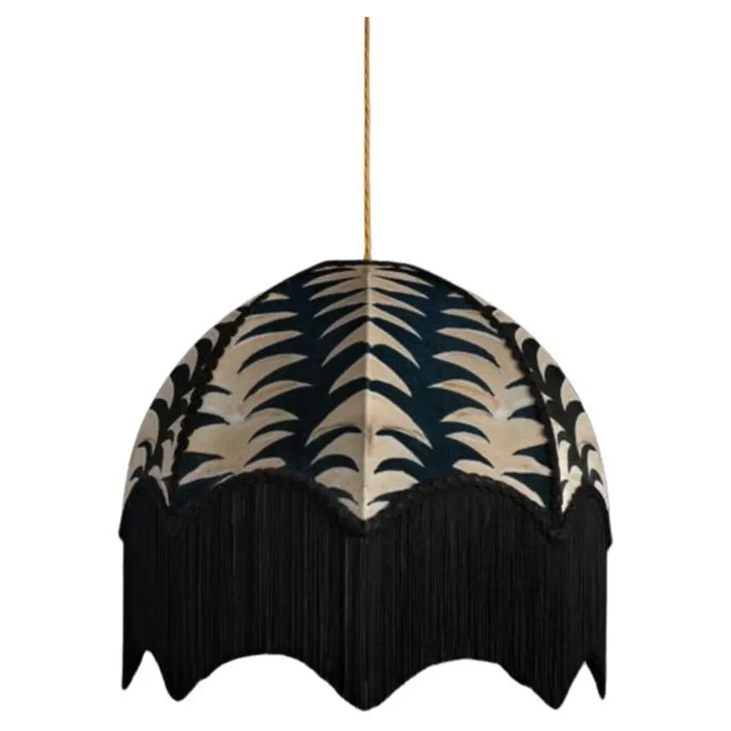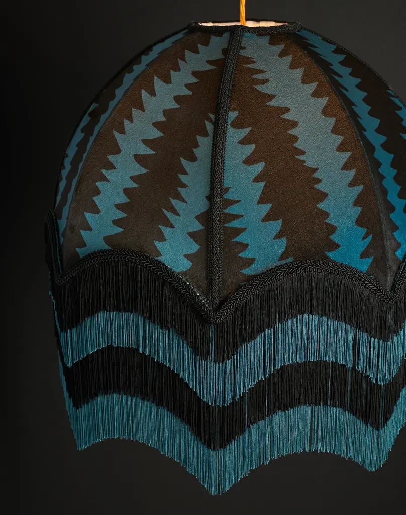 Fitz is a lively design in simple black and teal zigzag stripes, painted by Anna. The movement in this design enhances the ‘Jazz Age’ quality of this beautiful lampshade, as do the four layers of decadent, alternating fringe.Anna Hayman lampshades create a fantastic centrepiece to a room and work as well on a lamp base as they do as pendants, especially now we are able to offer gold linings. Treat yourself to a beautiful piece of artistry, all made in the UK.Every piece is handmade to order and takes 5-7 weeks to be made and delivered. A piece for your interior to treasure and delight in, these emit a soft glow which lights up a room so beautifully.The Duchess satin lets more light through than the velvet, as does the white lining rather than the gold. You can use a higher wattage/lumen strength bulb if you’d like the heavier velvet fabric.The dimensions are below – please bear in mind fringe colour/length is able to be altered easily as is the braid trim. Do email us for alternative options.Frame Diameter: 18"Frame Height: 10.5"Fringe Length: 8" (4 layers at 2", 4", 6" and 8")Flex and fitting are not included.The attachment for your lamp or pendant fitting is included – choice of lamp or hanging pendant attachment, these are both adjustable for UK or Euro (E27) fittings, as well as US E26. Email us if you’d like further information on this.
