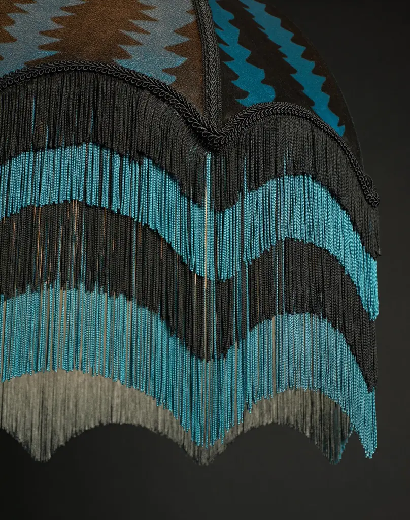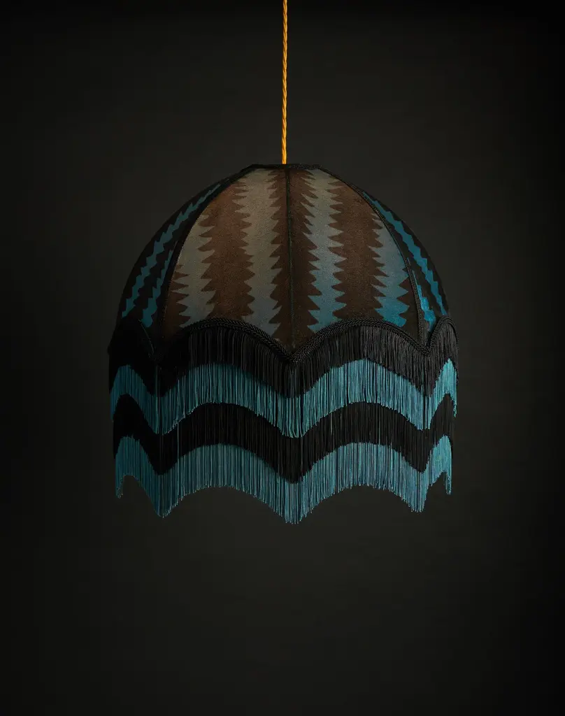 Fitz is a lively design in simple black and teal zigzag stripes, painted by Anna. The movement in this design enhances the ‘Jazz Age’ quality of this beautiful lampshade, as do the four layers of decadent, alternating fringe.Anna Hayman lampshades create a fantastic centrepiece to a room and work as well on a lamp base as they do as pendants, especially now we are able to offer gold linings. Treat yourself to a beautiful piece of artistry, all made in the UK.Every piece is handmade to order and takes 5-7 weeks to be made and delivered. A piece for your interior to treasure and delight in, these emit a soft glow which lights up a room so beautifully.The Duchess satin lets more light through than the velvet, as does the white lining rather than the gold. You can use a higher wattage/lumen strength bulb if you’d like the heavier velvet fabric.The dimensions are below – please bear in mind fringe colour/length is able to be altered easily as is the braid trim. Do email us for alternative options.Frame Diameter: 14"Frame Height: 6"Fringe Length: 8" (4 layers at 2", 4", 6" and 8")Flex and fitting are not included.The attachment for your lamp or pendant fitting is included – choice of lamp or hanging pendant attachment, these are both adjustable for UK or Euro (E27) fittings, as well as US E26. Email us if you’d like further information on this.