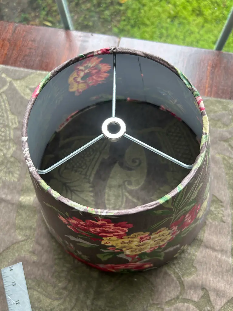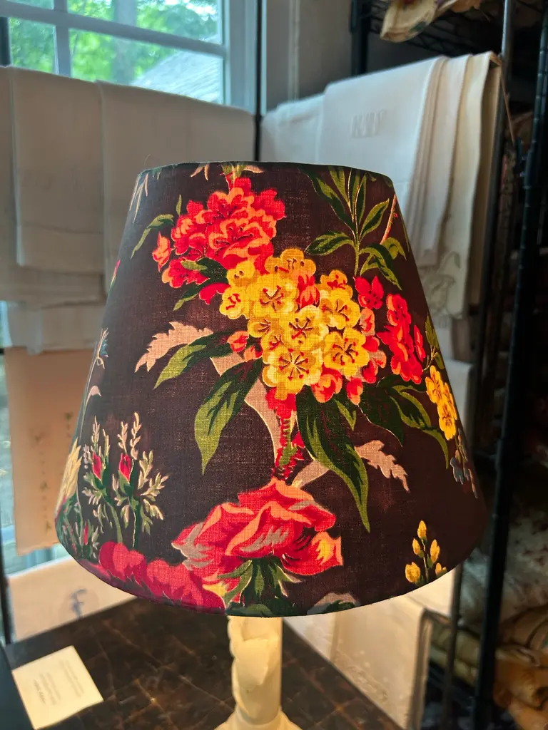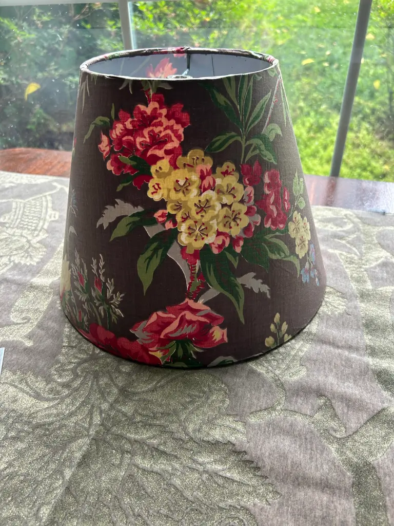 A lampshade handmade from a vintage floral fabric, measures top 6” bottom 11” side 8.5”