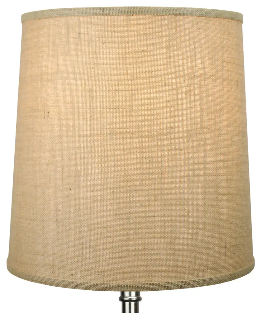 Urbanest French drum lampshade in burlap is a way to add textural light to any space. Shade measures 10" across the top, 12" across the bottom and 8.5" overall height Spider harp fitter works with most standard harps and lamp bases. Bulb not included.